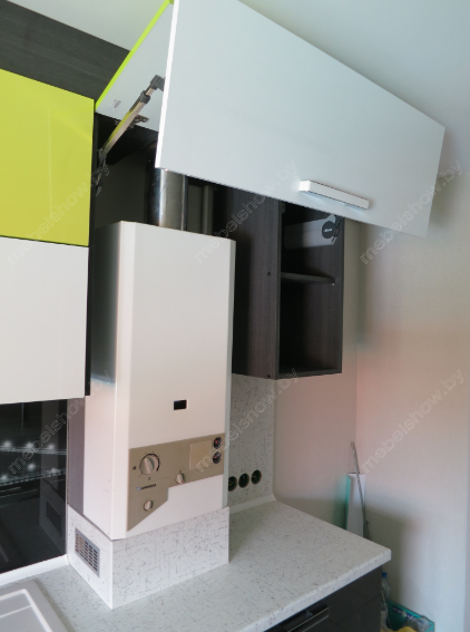 Данный кухонный гарнитур выполнен преимущественно в темных тонах. Кухня оснащена светлой столешницей и подвесными шкафчиками с ярким элементом. Буфет имеет темное матовое остекление.