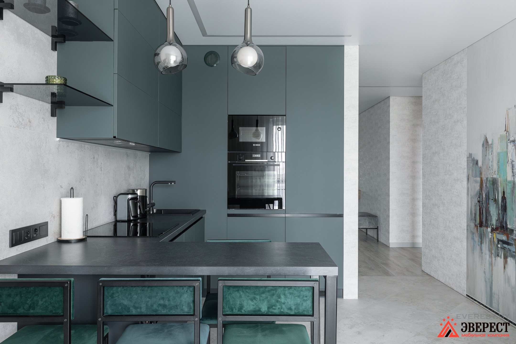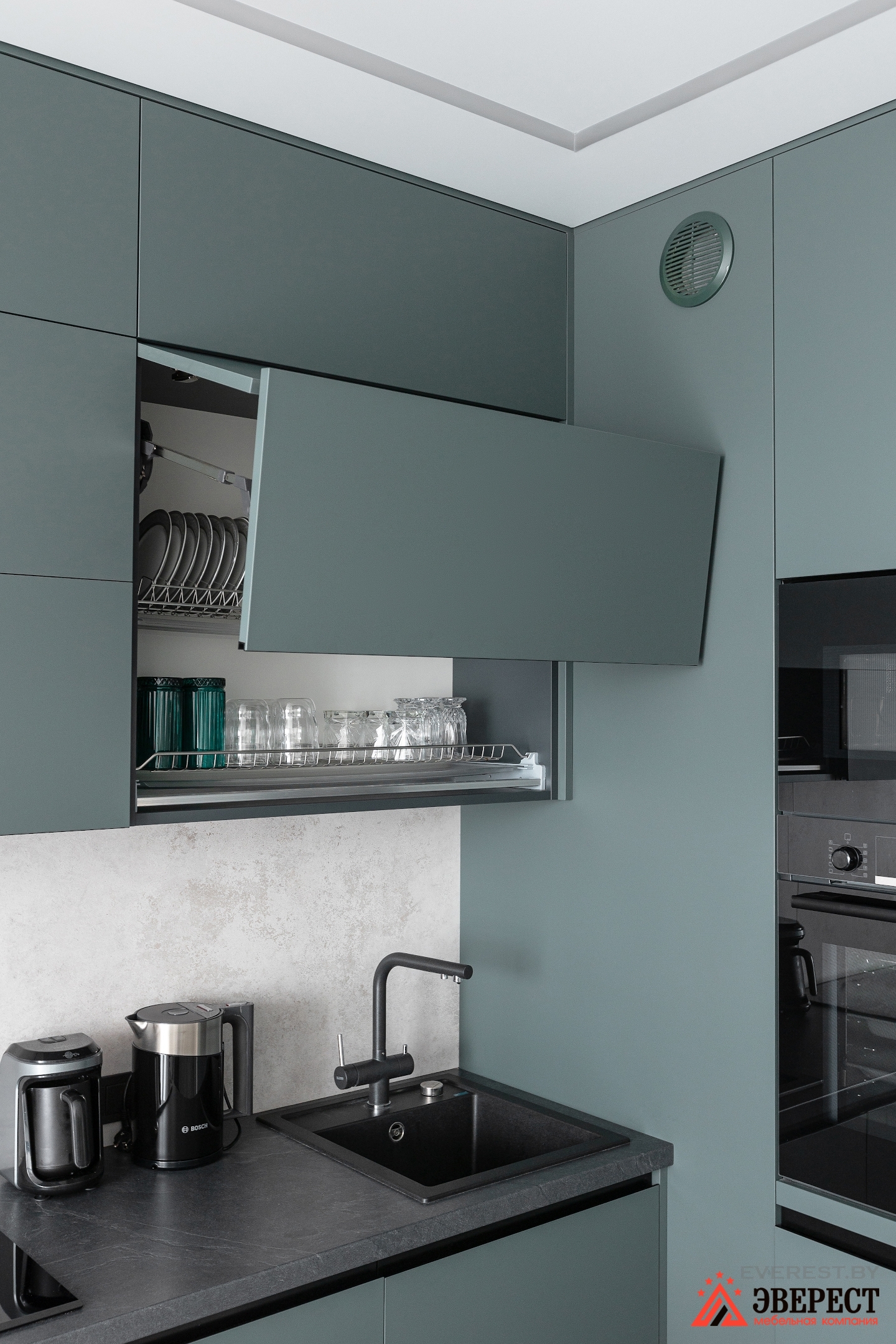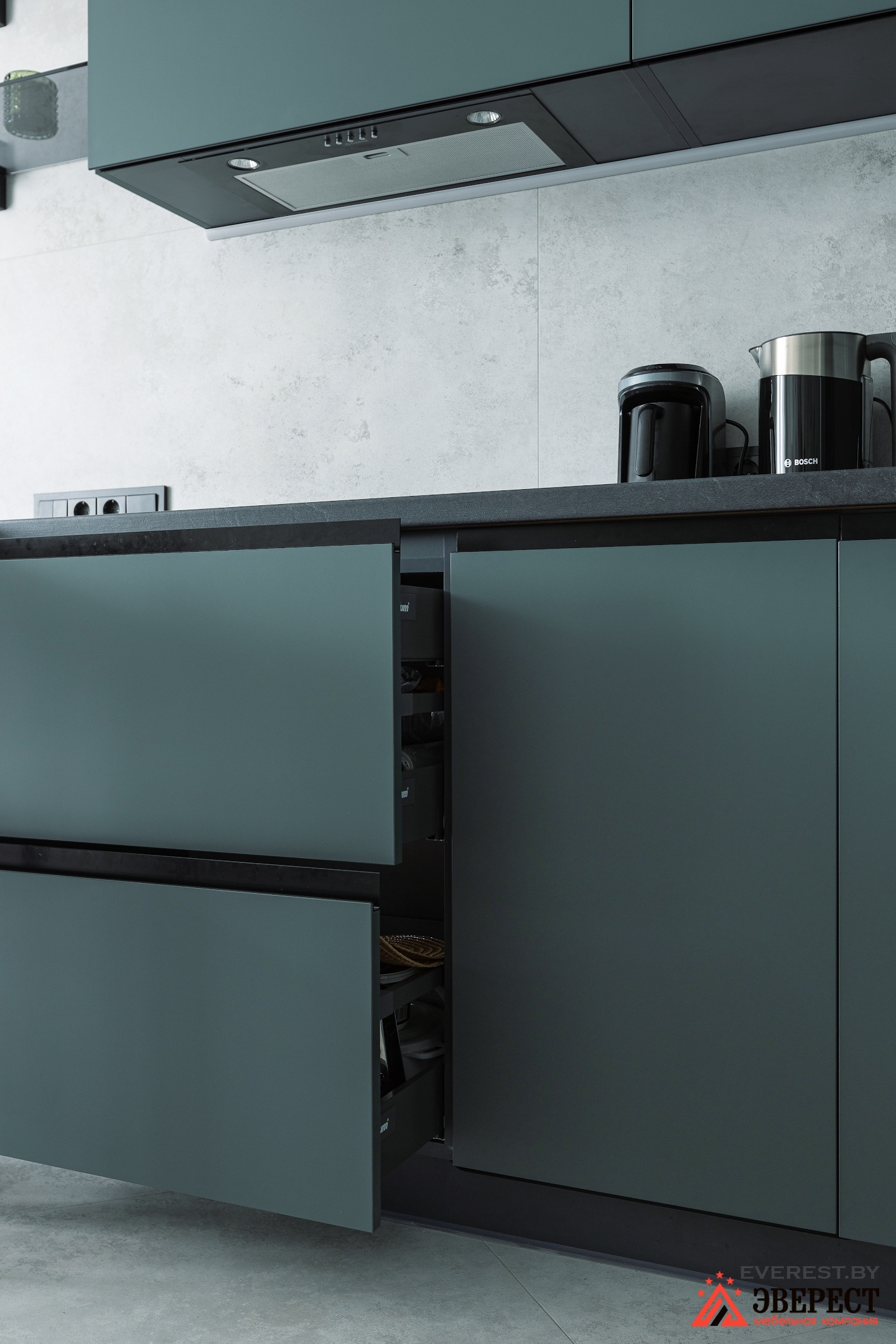 Фасады матовые из крашеного МДФ. Фурнитура: Blum (Австрия).