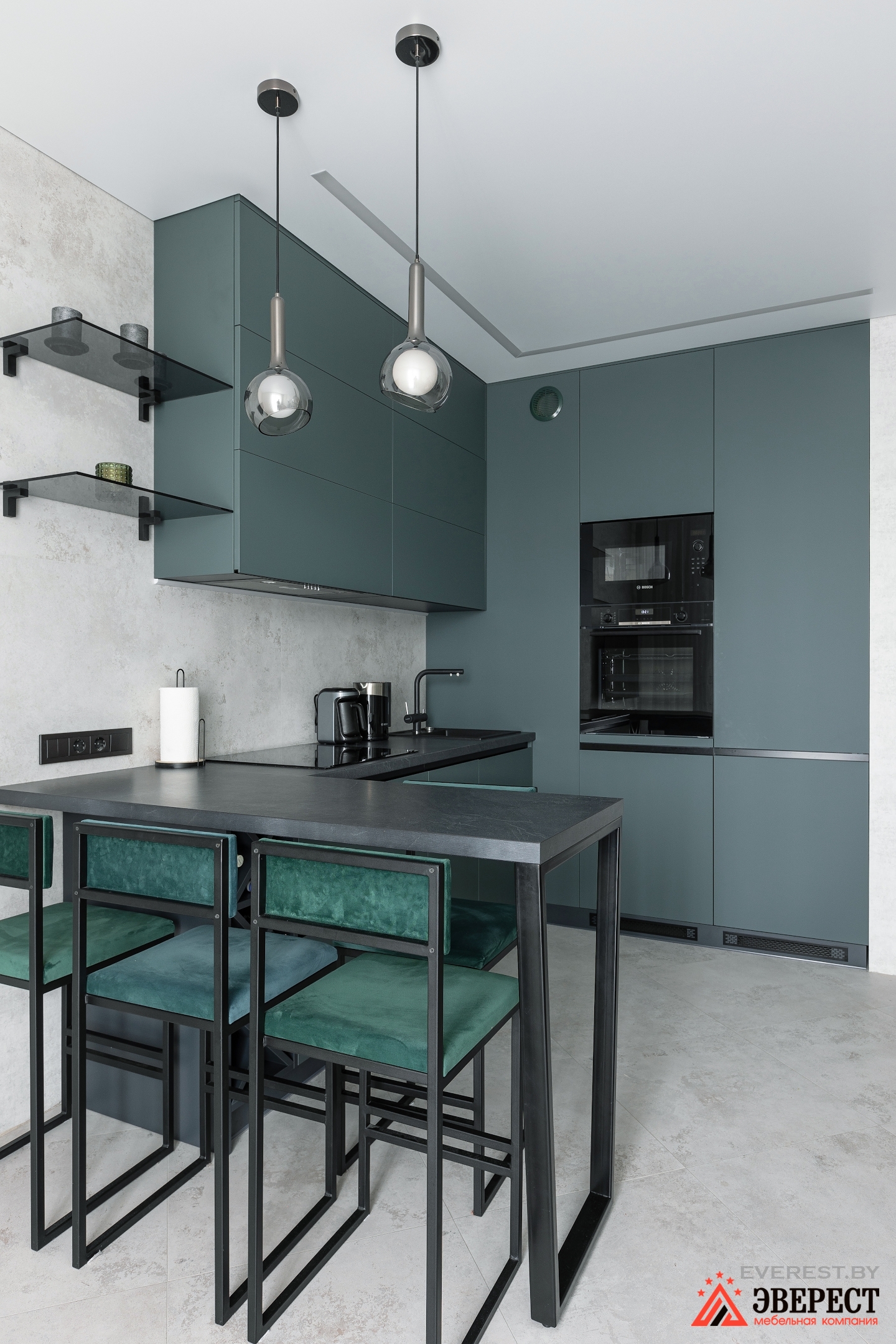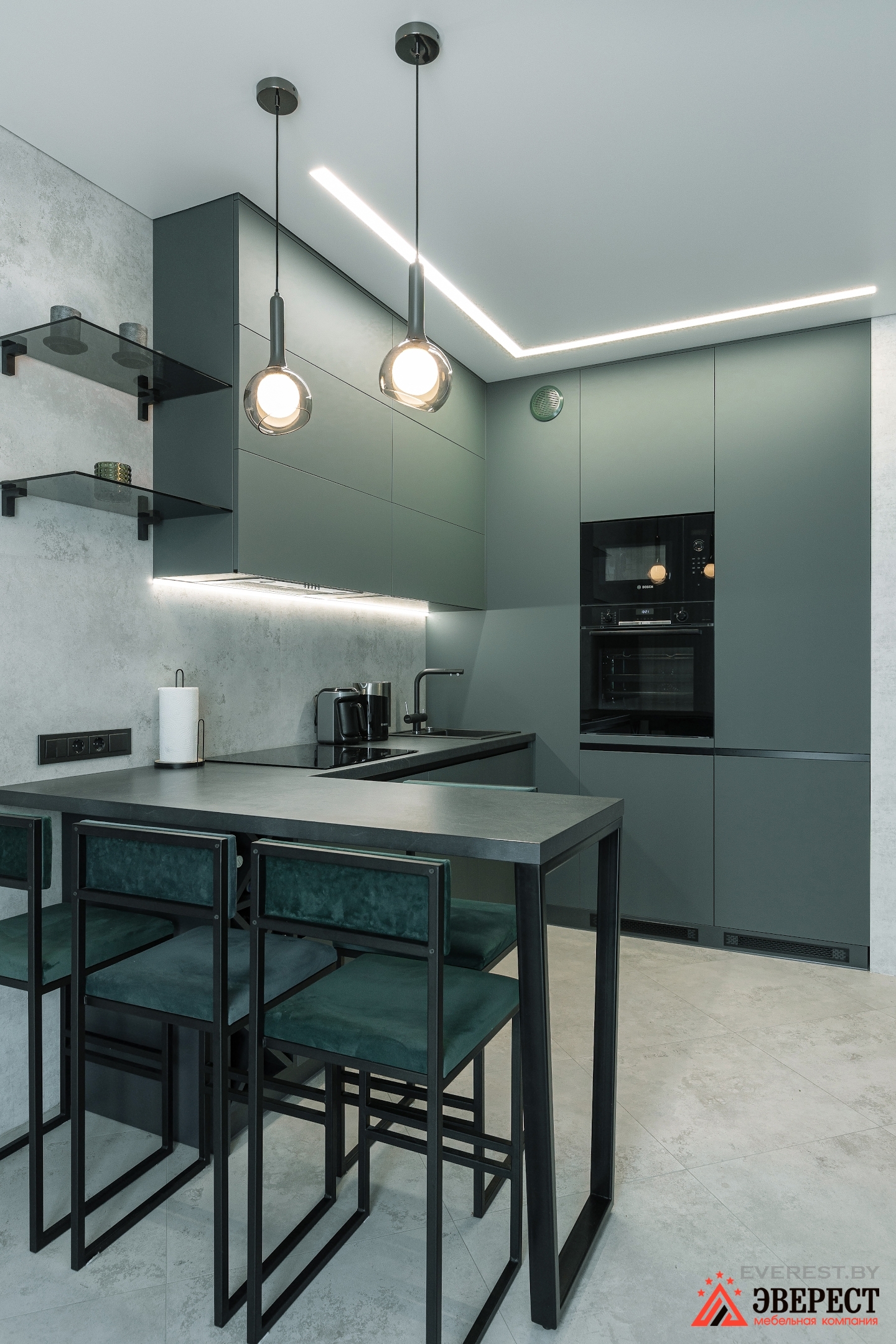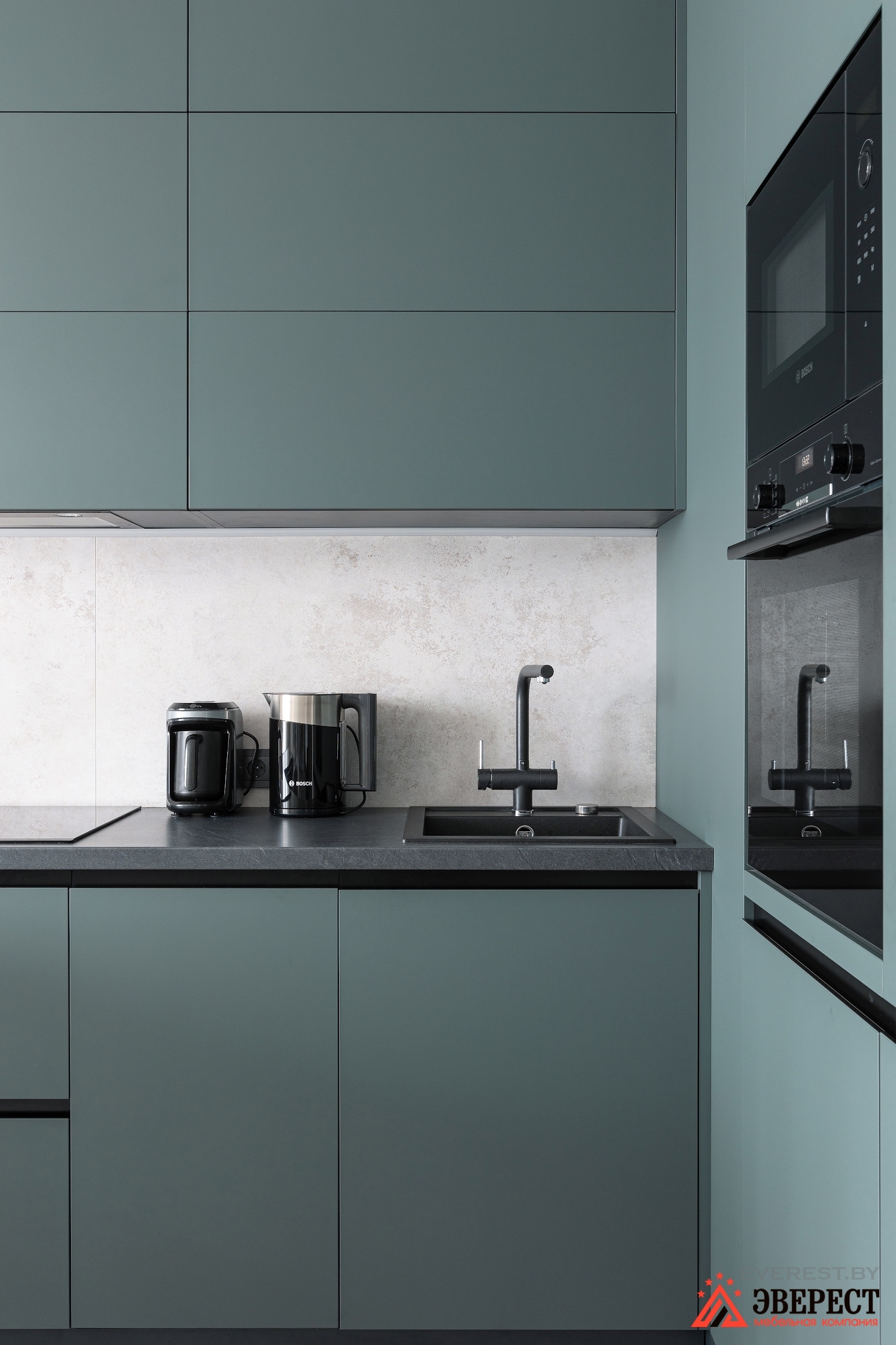 Фасады матовые из крашеного МДФ. Фурнитура: Blum (Австрия).