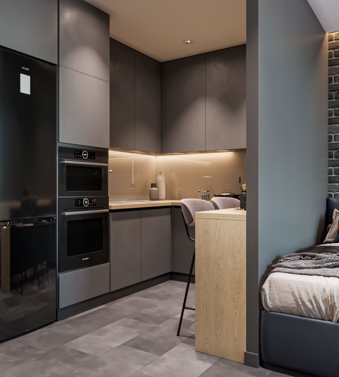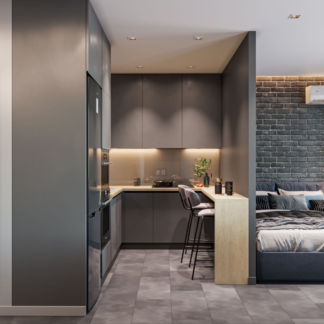 Компактная п-образная серая кухня без ручек с обеденной зоной