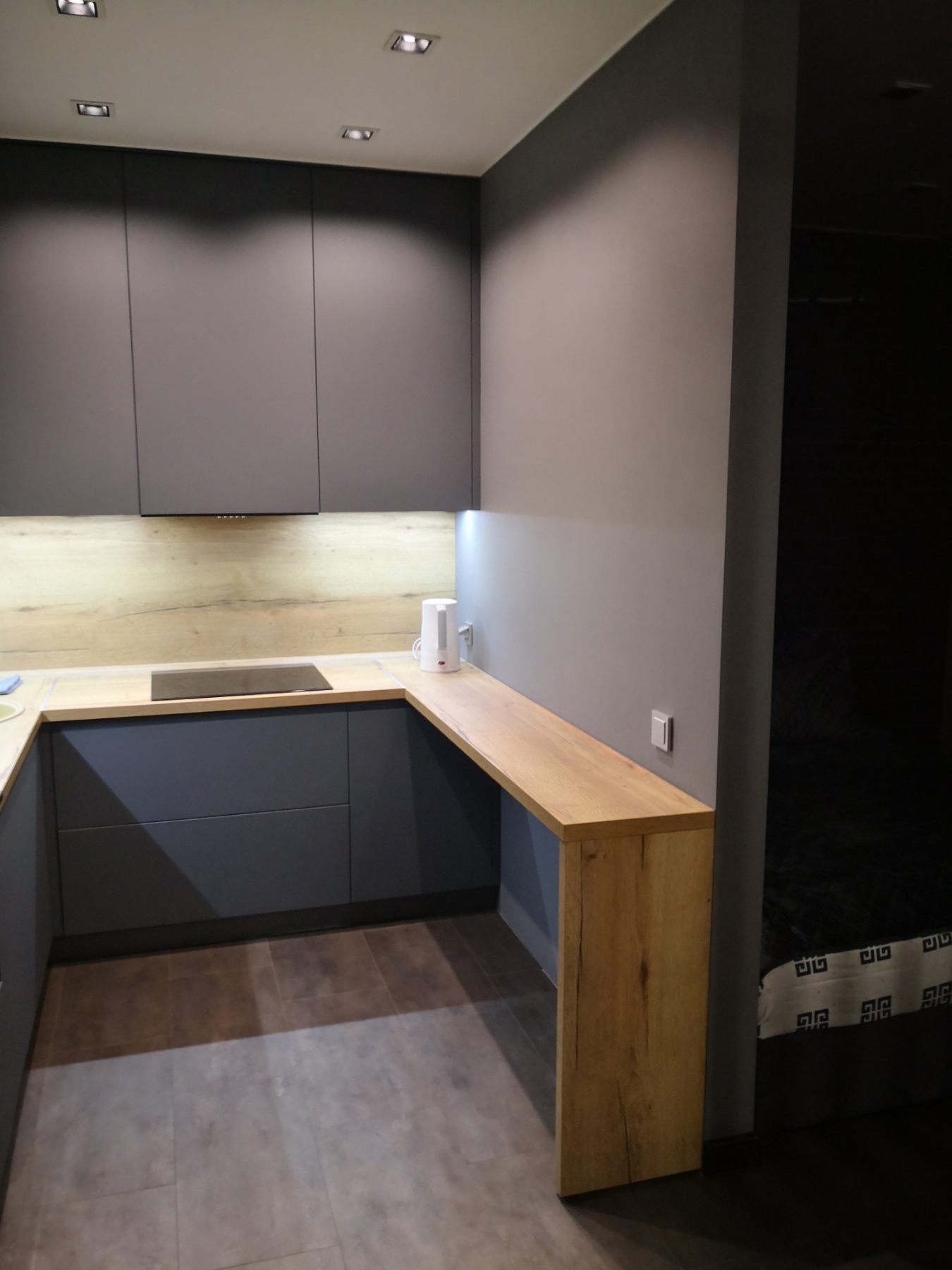 Угловая кухня с большим пеналом. Подсветка. Подвесные верхние шкафы.