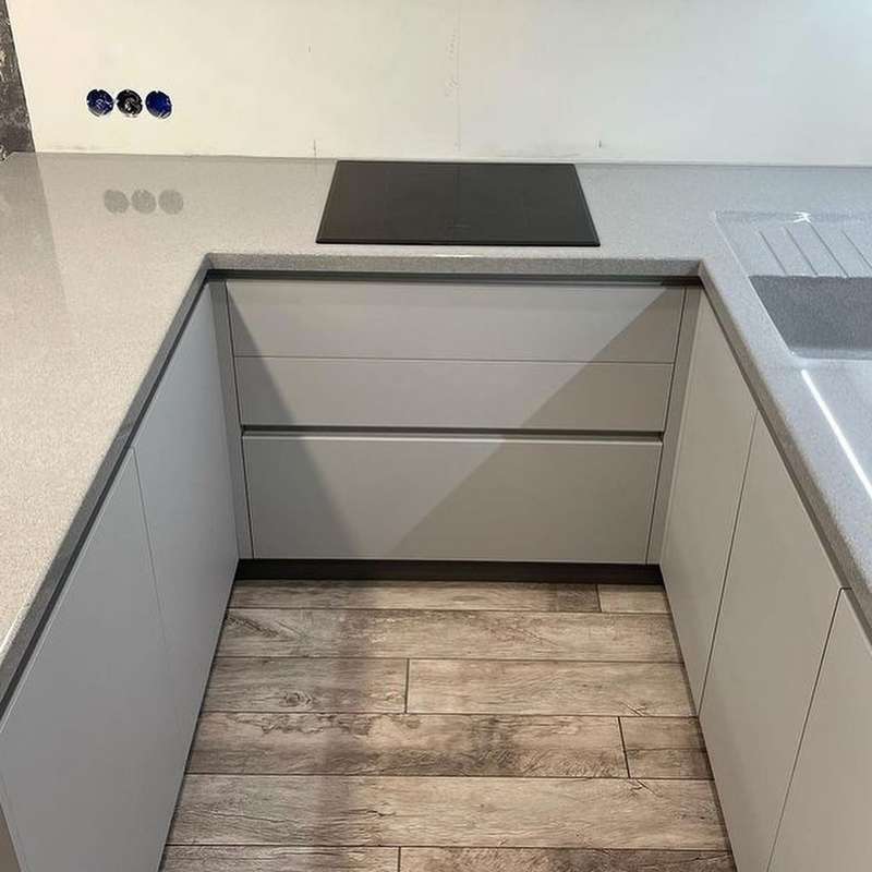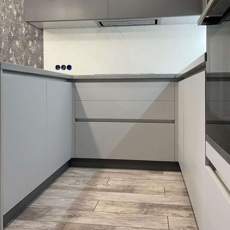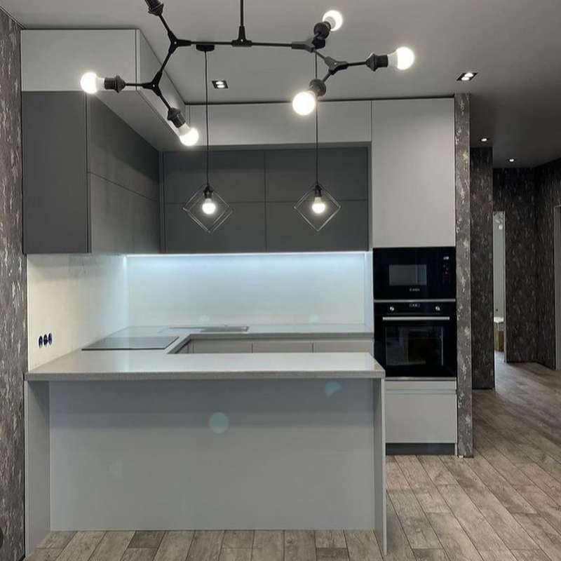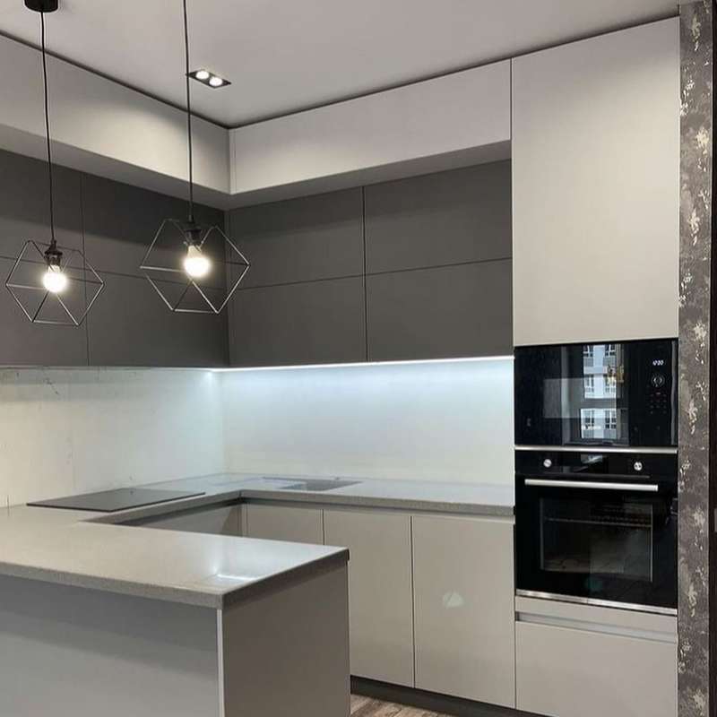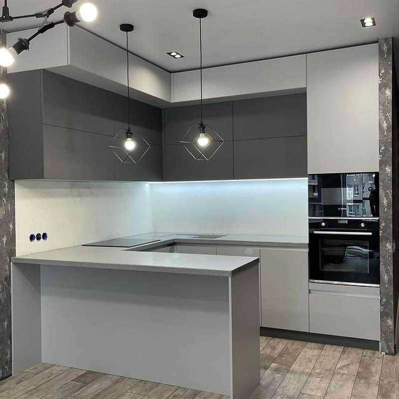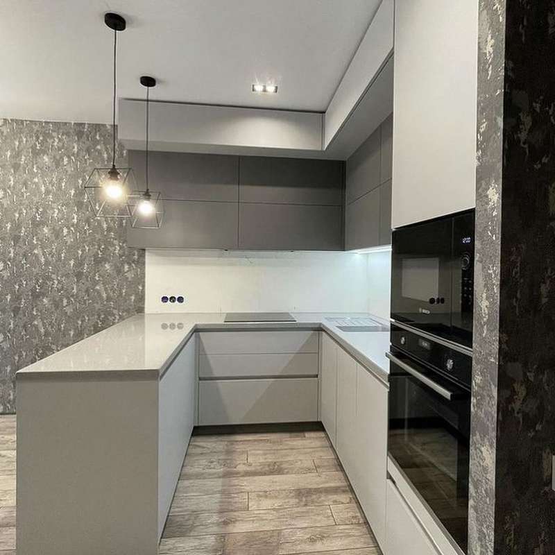 Угловая кухня 150х150 см с темными и светлыми фасадами.