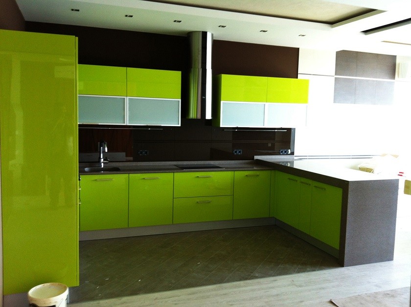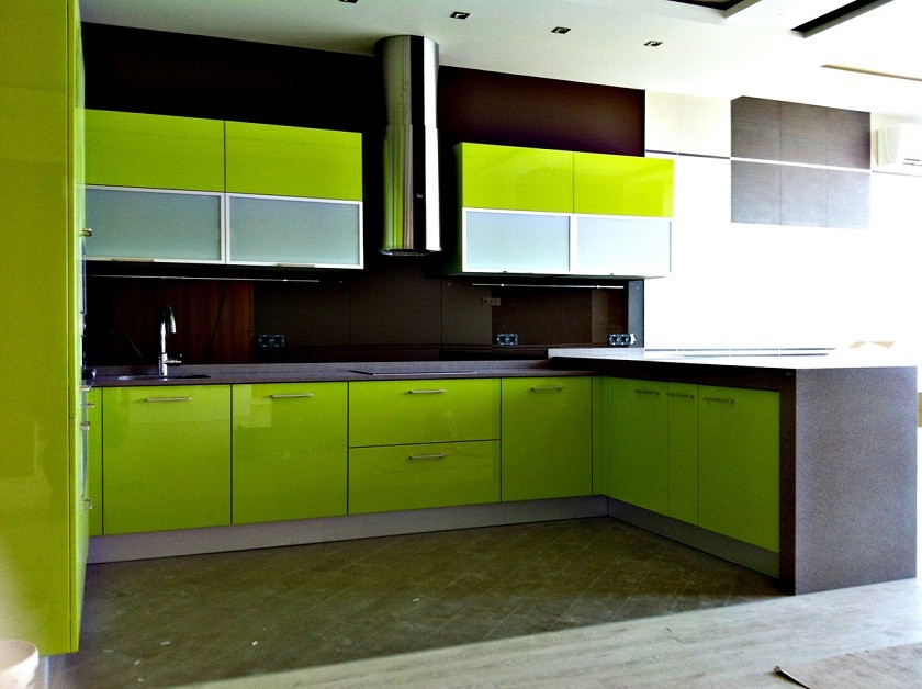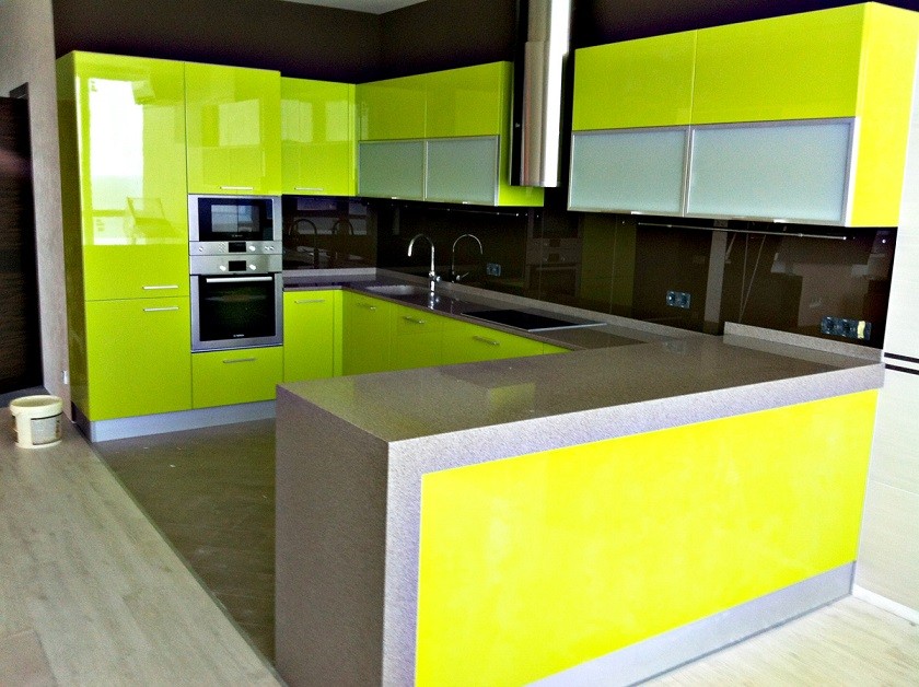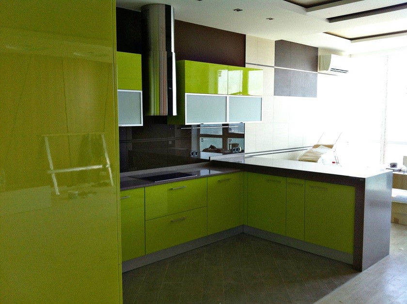 П-образная кухня с пластиковыми фасадами, накладной ручкой