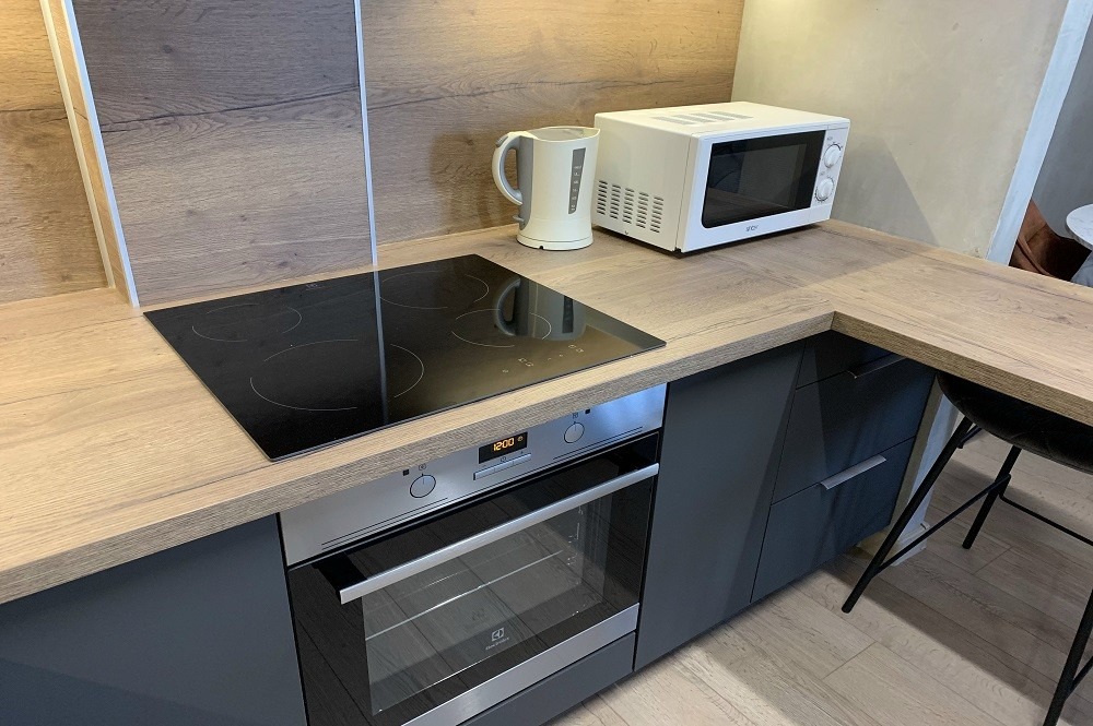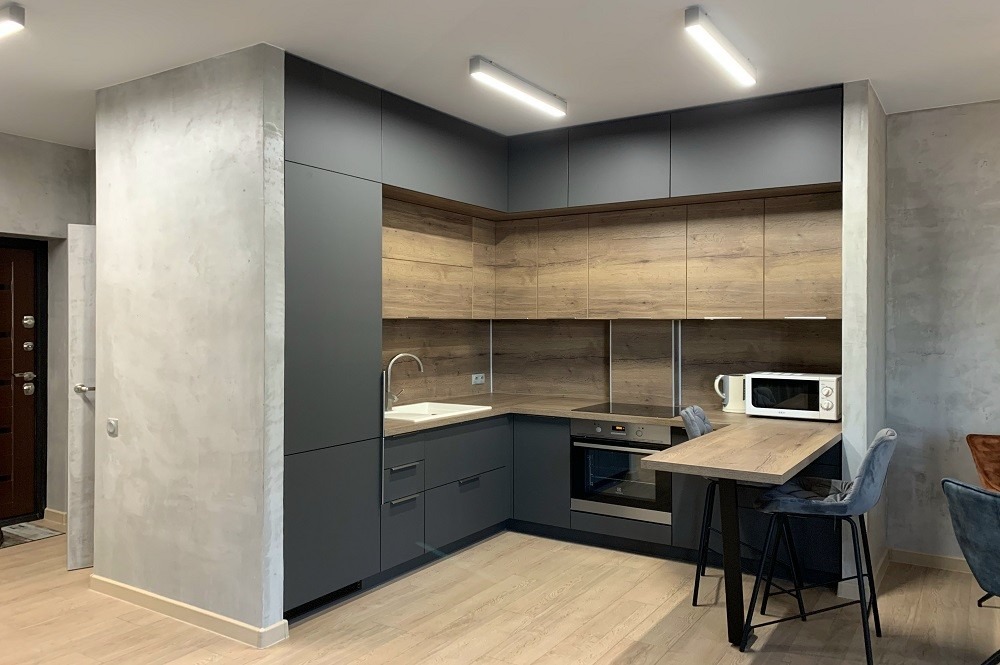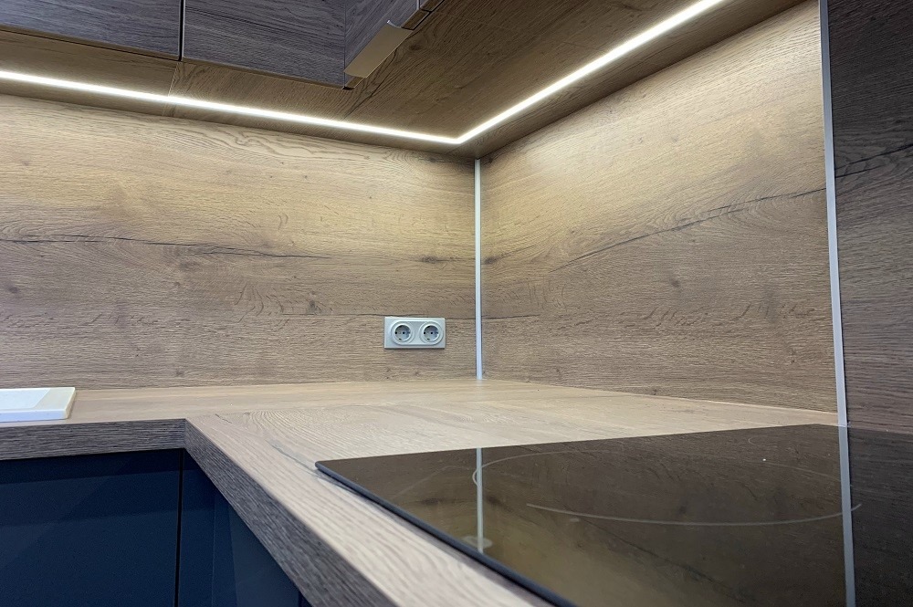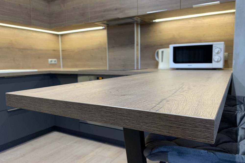 Однотонный древесный цвет фасадов из ЛДСП. Ширина кухни 150 см.