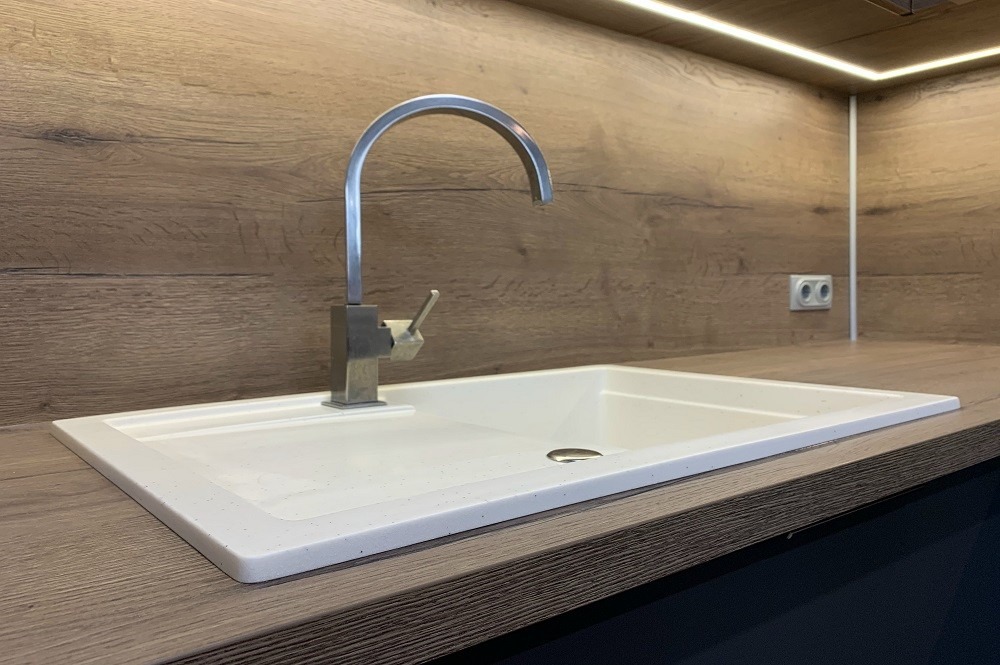 Используются покрытые эмалью фасады МДФ 19 мм с интегрированной ручкой.