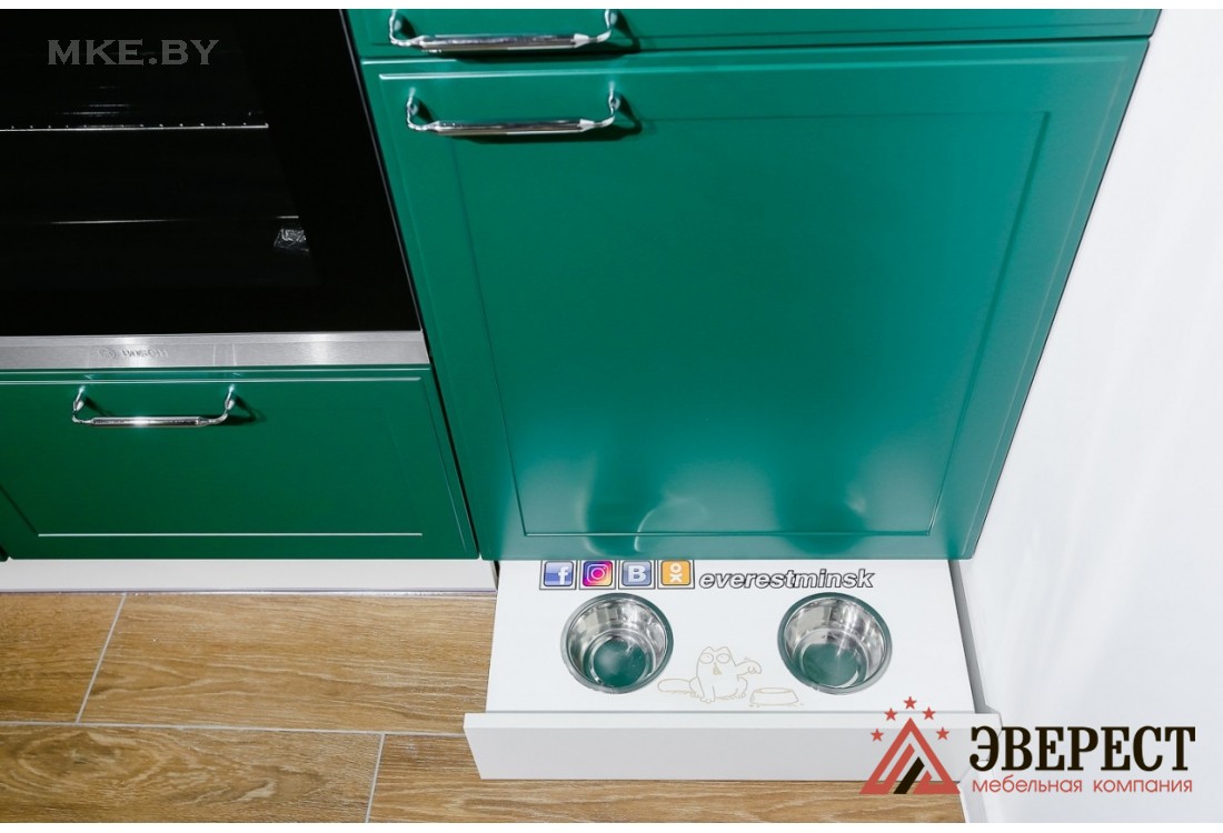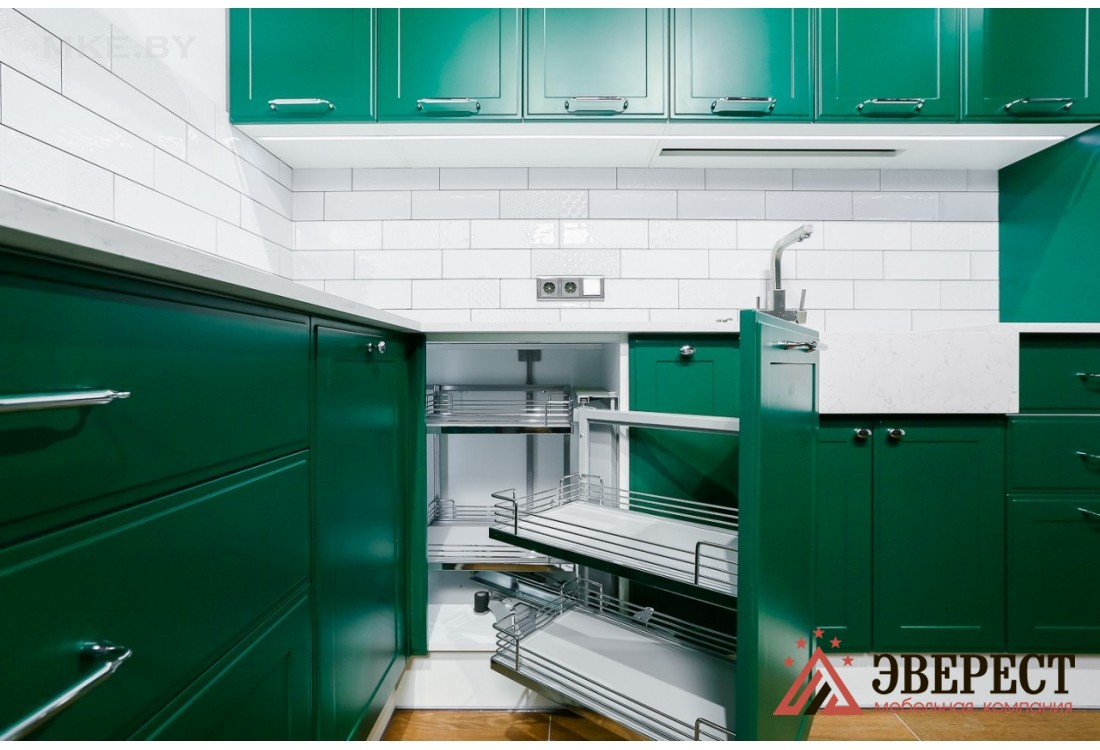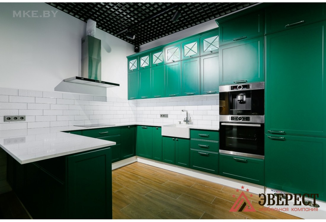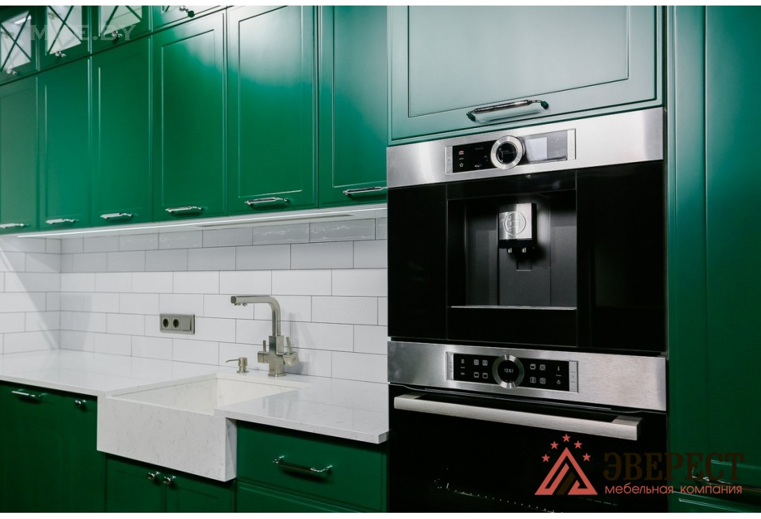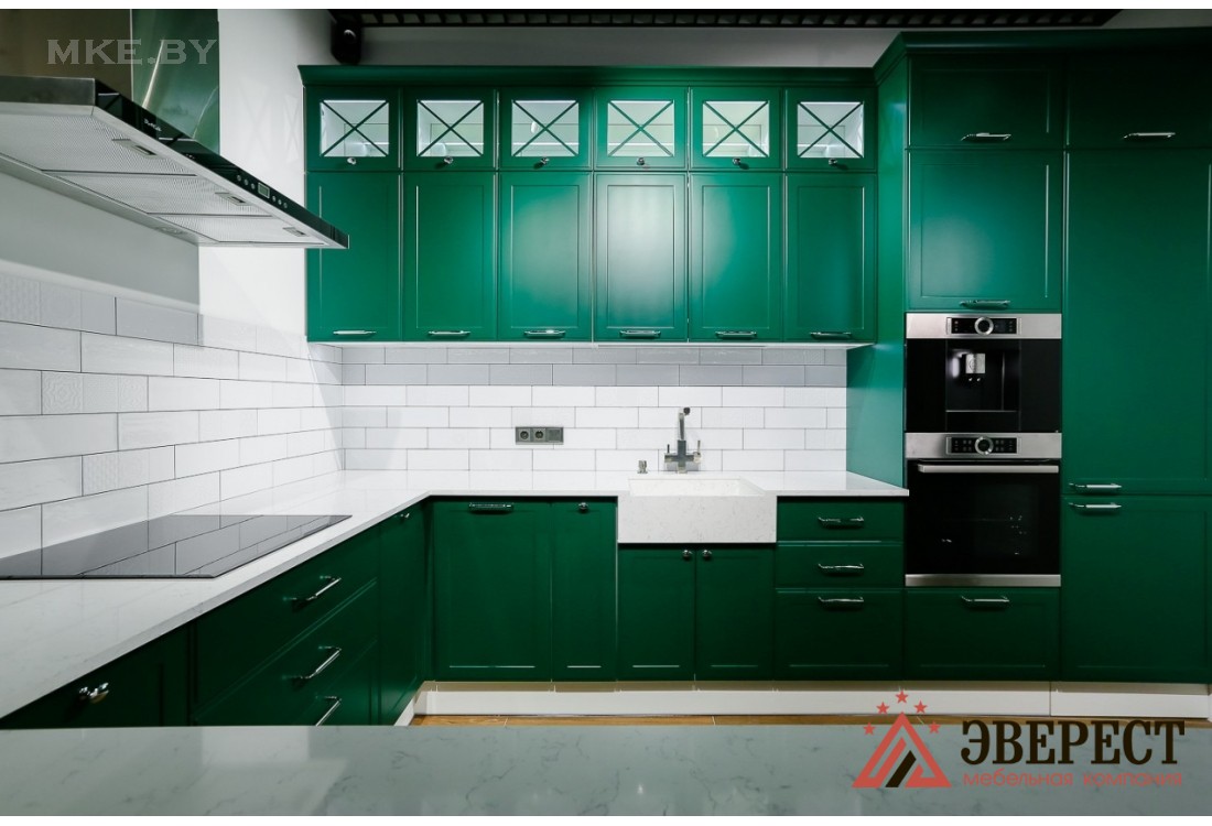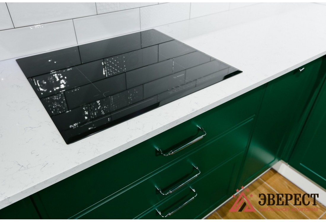 П-образная кухня с просторной рабочей для больших кухонных помещений. Фасады с удобными хромированными ручками оформлены в матовом зеленом цвете и гармонируют с белой столешницей. Модель изготовлена из МДФ. Кухни из МДФ легко моются и отчищаются от грязи, обладают высокой устойчивостью к влаге, высоким температурам, и механическим воздействиям.