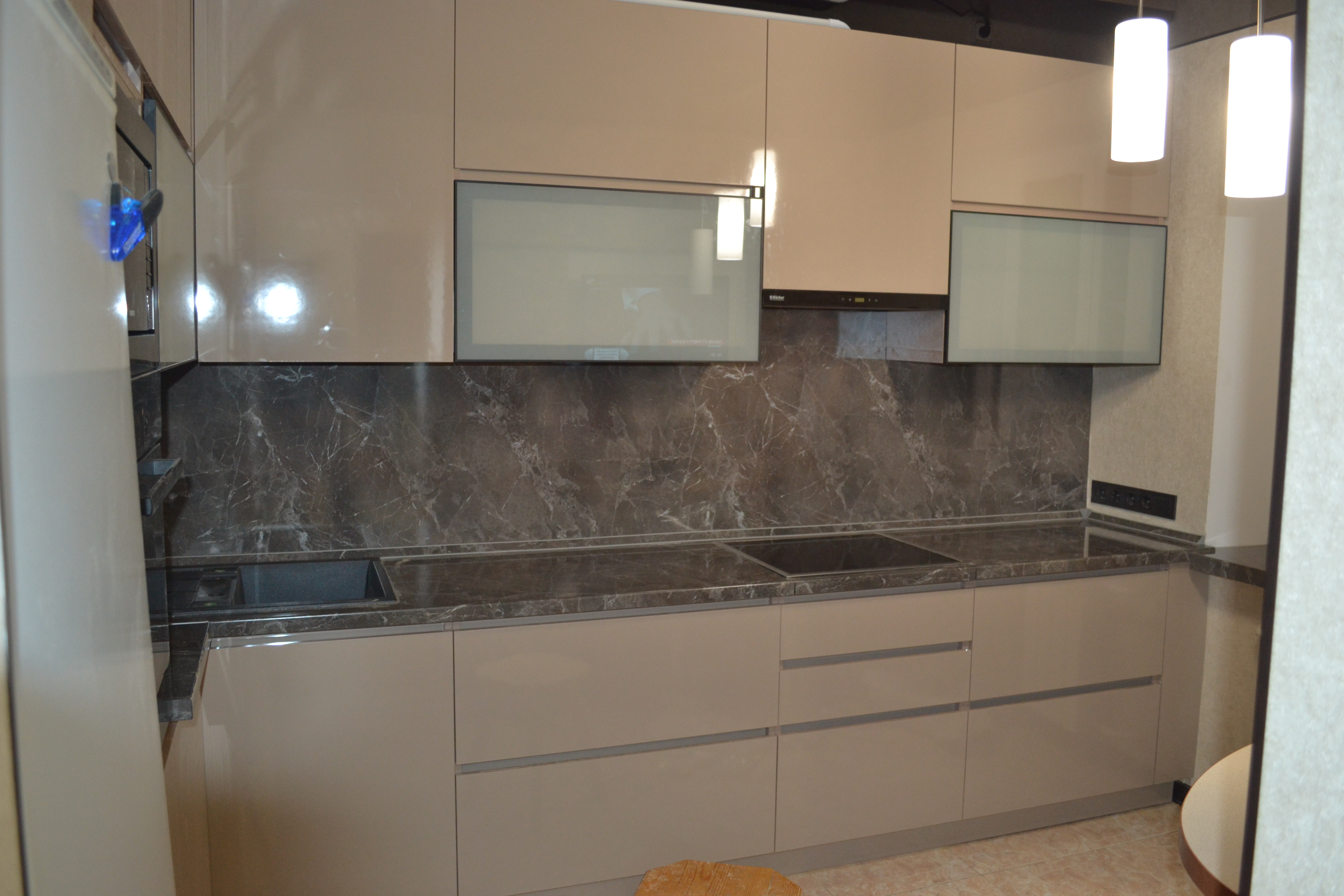 код 89394Глянцевые фасады со вставками лакобеля. Столешница и фартук под серый мрамор.