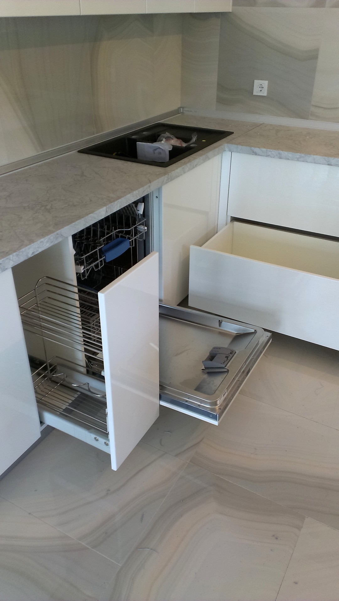 Установка врезной мойки. Распашные шкафы.