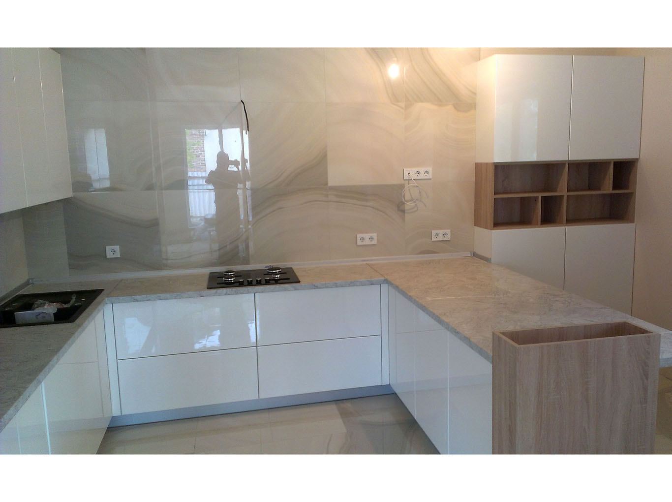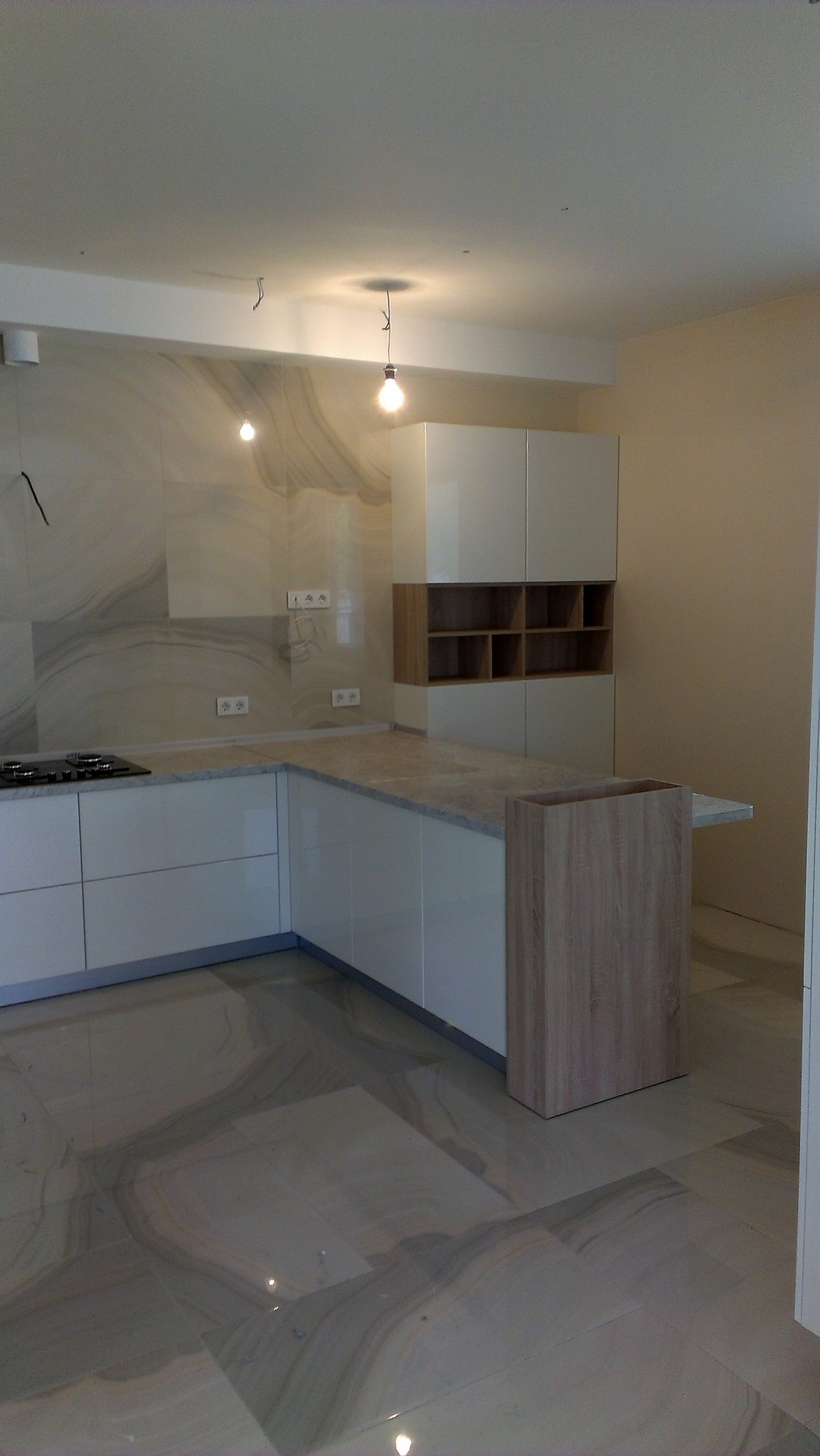 Просторная кухня выполнена в белом цвете с глянцевыми фасадами. В конструкции кухни предусмотрен отдельный модуль для встраиваемой техники. Столешница ламинирована под пробку, используется современная фурнитура с системой открытия дверки после легкого нажатия на нее. В модели предусмотрена удобная стойка для хранения напитков.