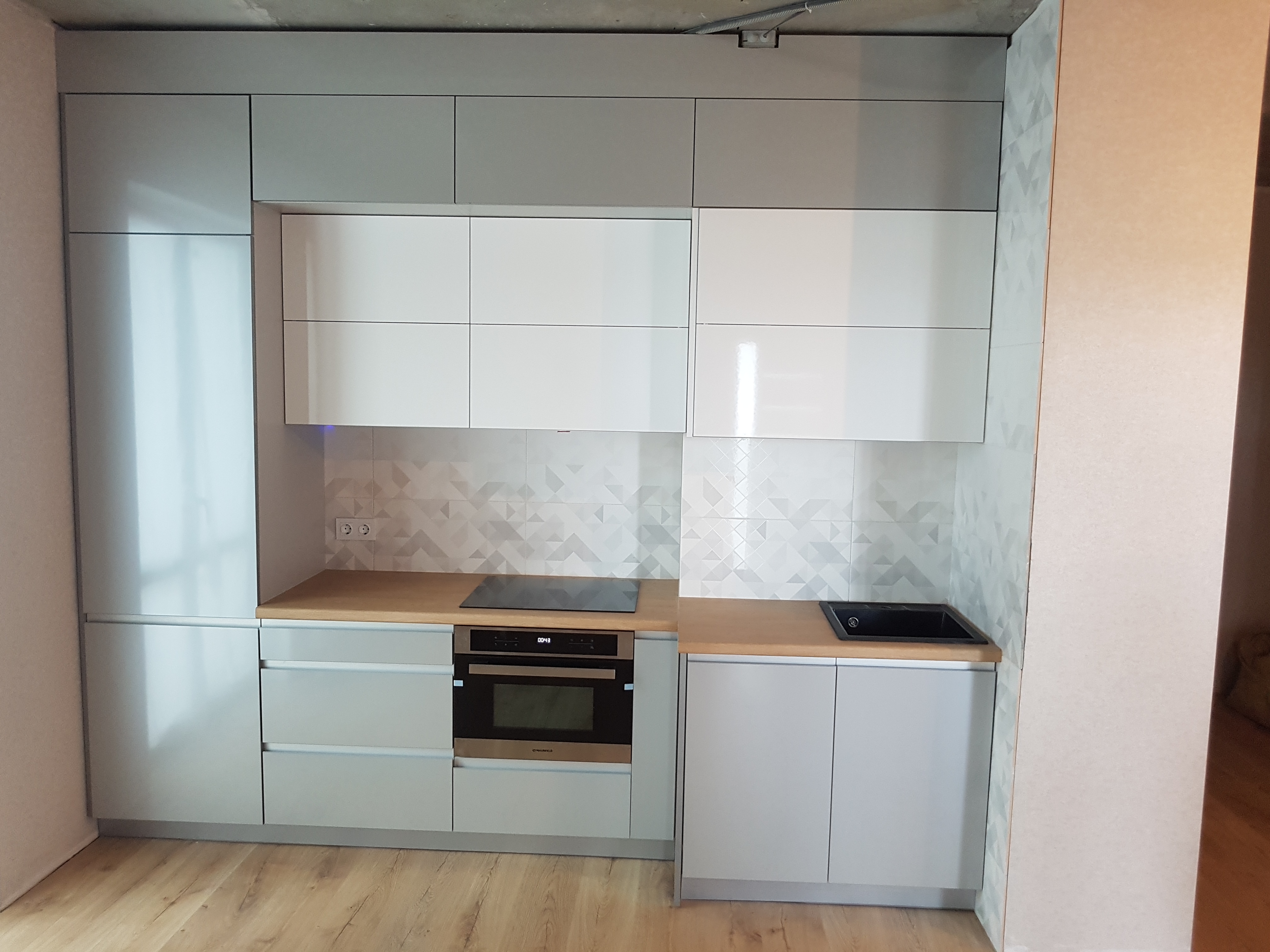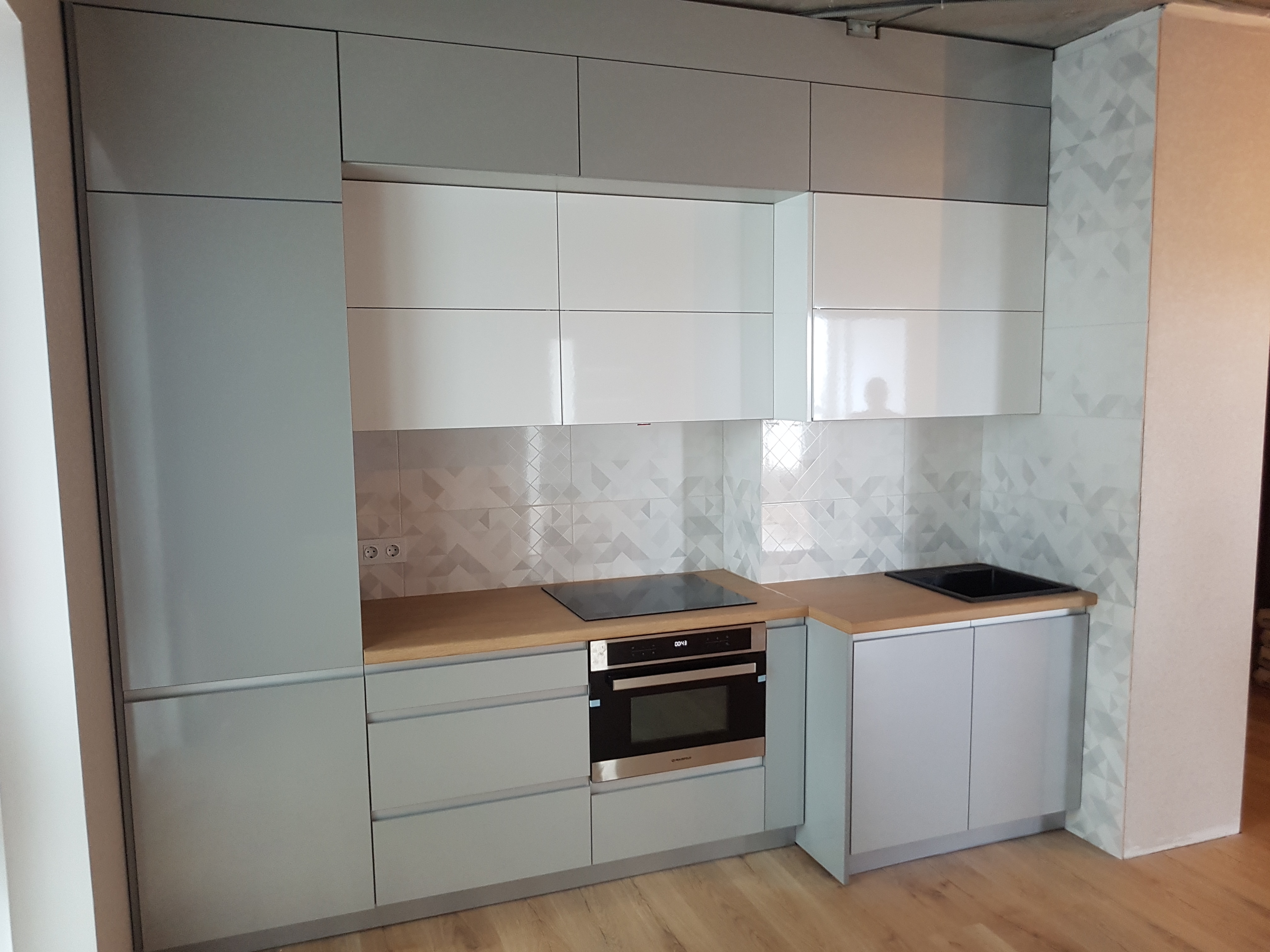 - Фасады без ручек: кухня оснащена фасадами без ручек, что придает ей современный и стильный вид. Это не только эстетически привлекательно, но и удобно в использовании.