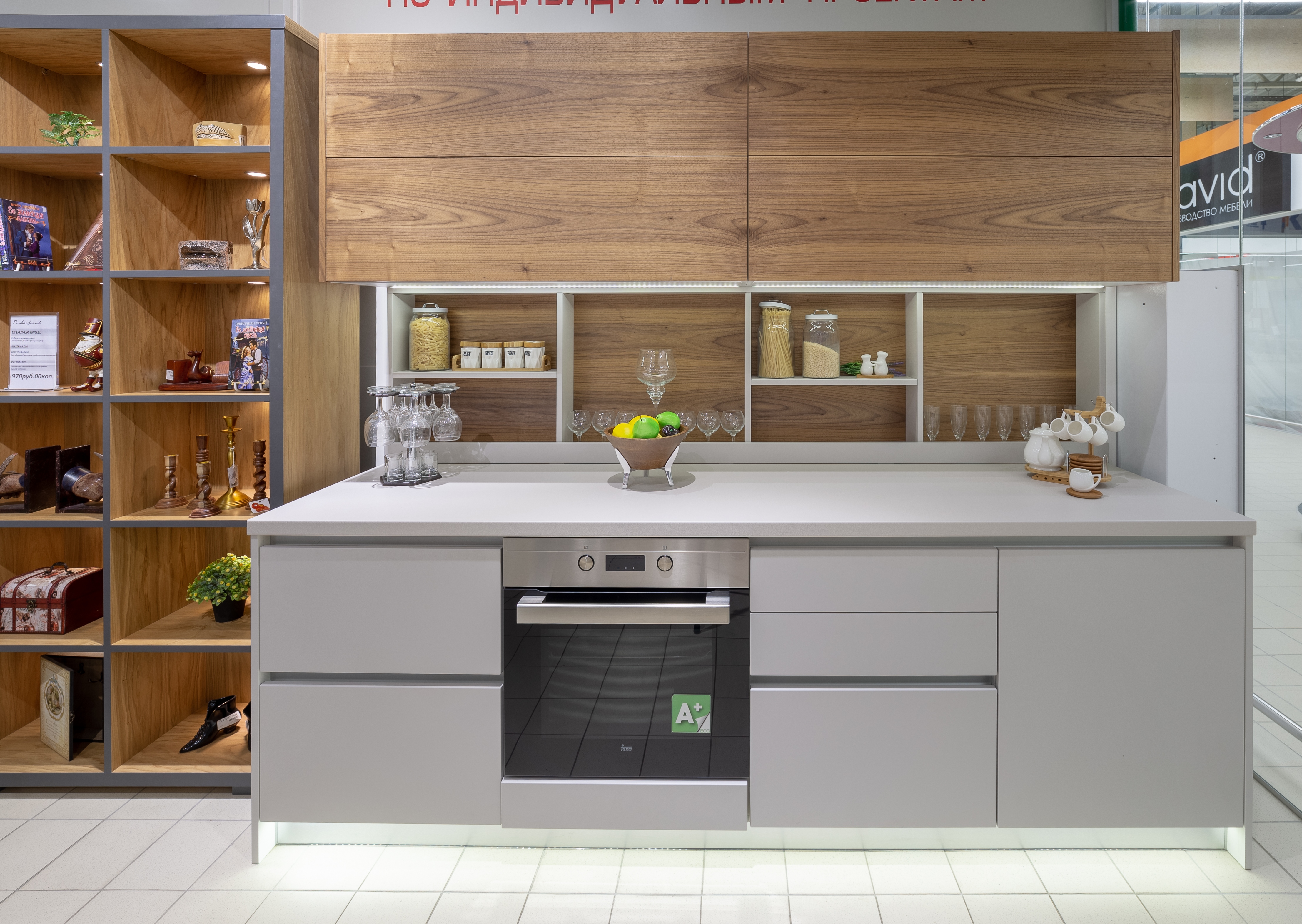 Лаконичный гарнитур с фасадами мягкого серого оттенка.