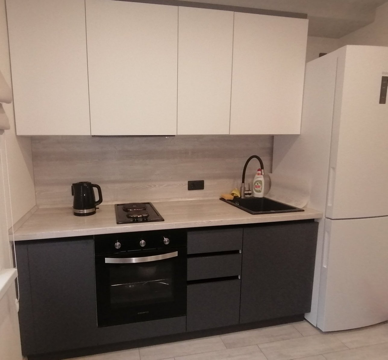 Кухня шириной 2.5 метров с матовыми фасадами. Мойка в комплект не входит.