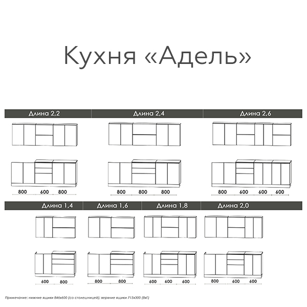 Общая ширина кухни: 2200 мм.