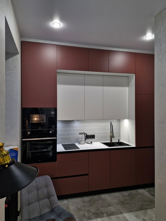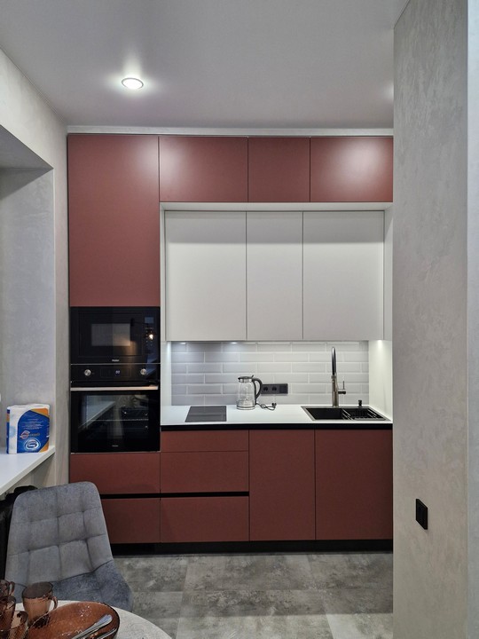 Прямая кухня без ручек с белой столешницей из компакт-плиты