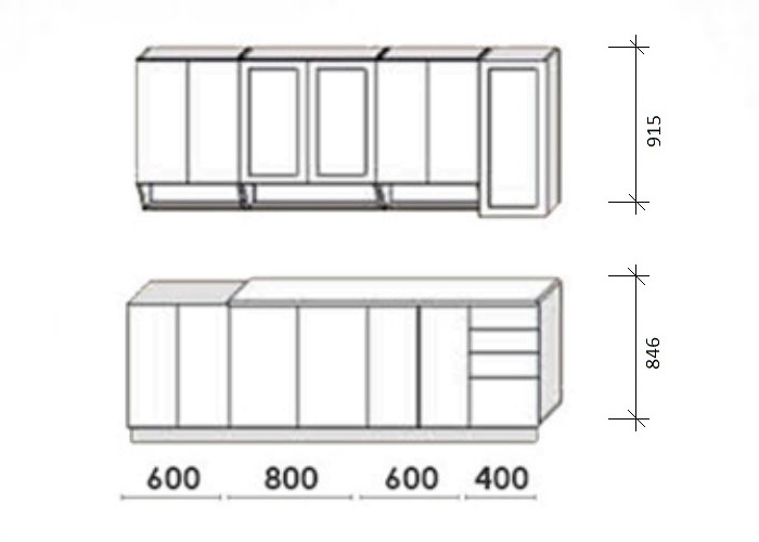 Фасад - крашеный МДФ, корпус - ДСП 16 мм, столешница - «марс глянец» с алюминиевой кромкой.
