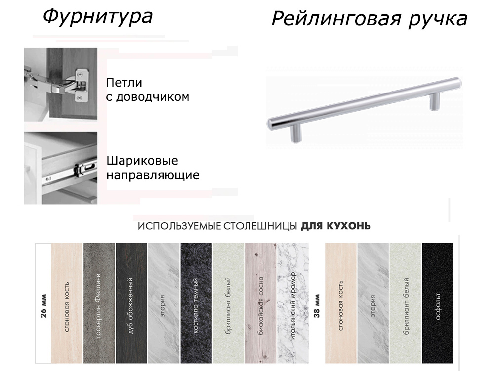 Фурнитура: петли с доводчиком, шариковые направляющие.