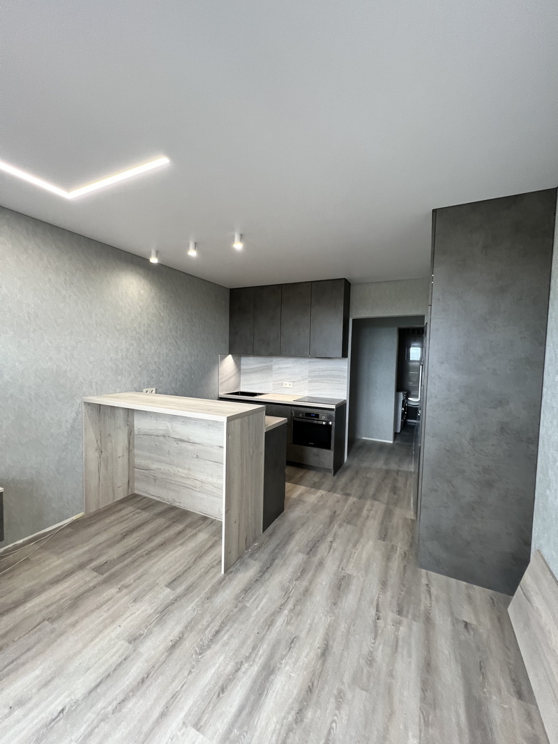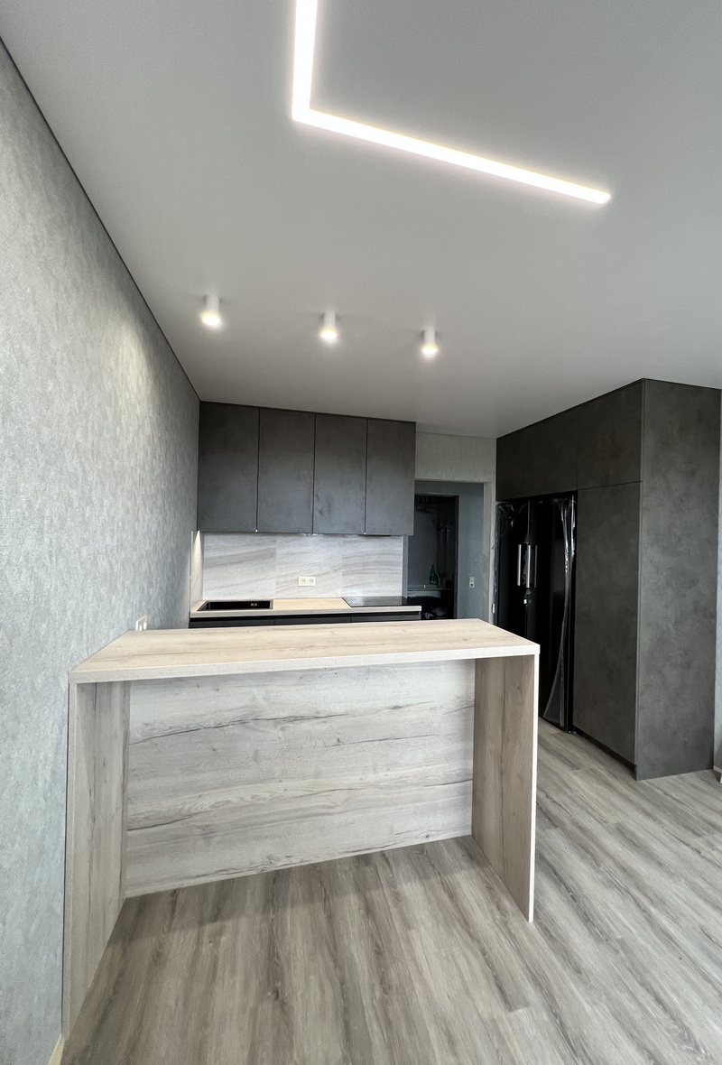 Прямая кухня гостиная с островом и холодильником Сайд Бай сайд