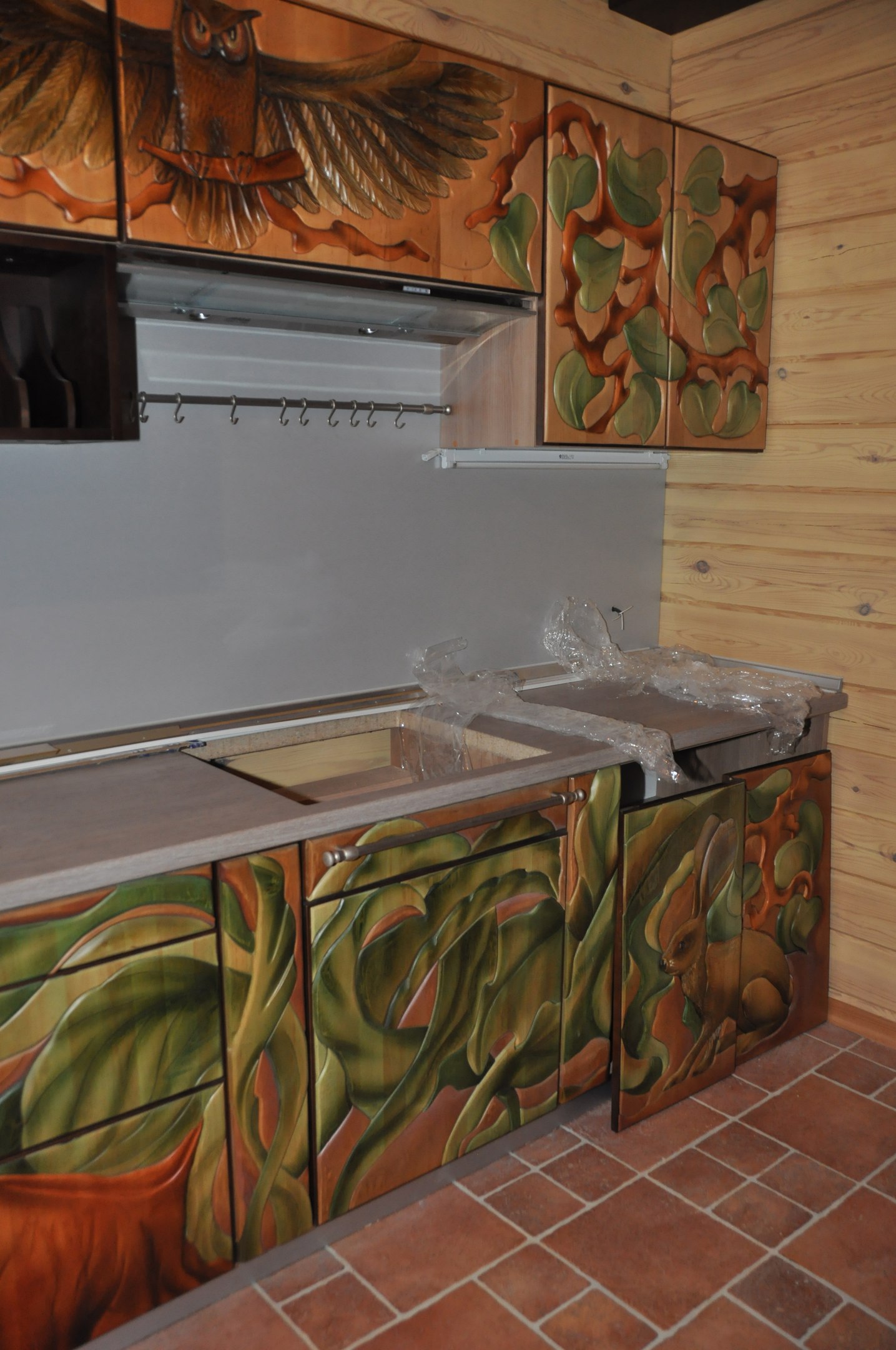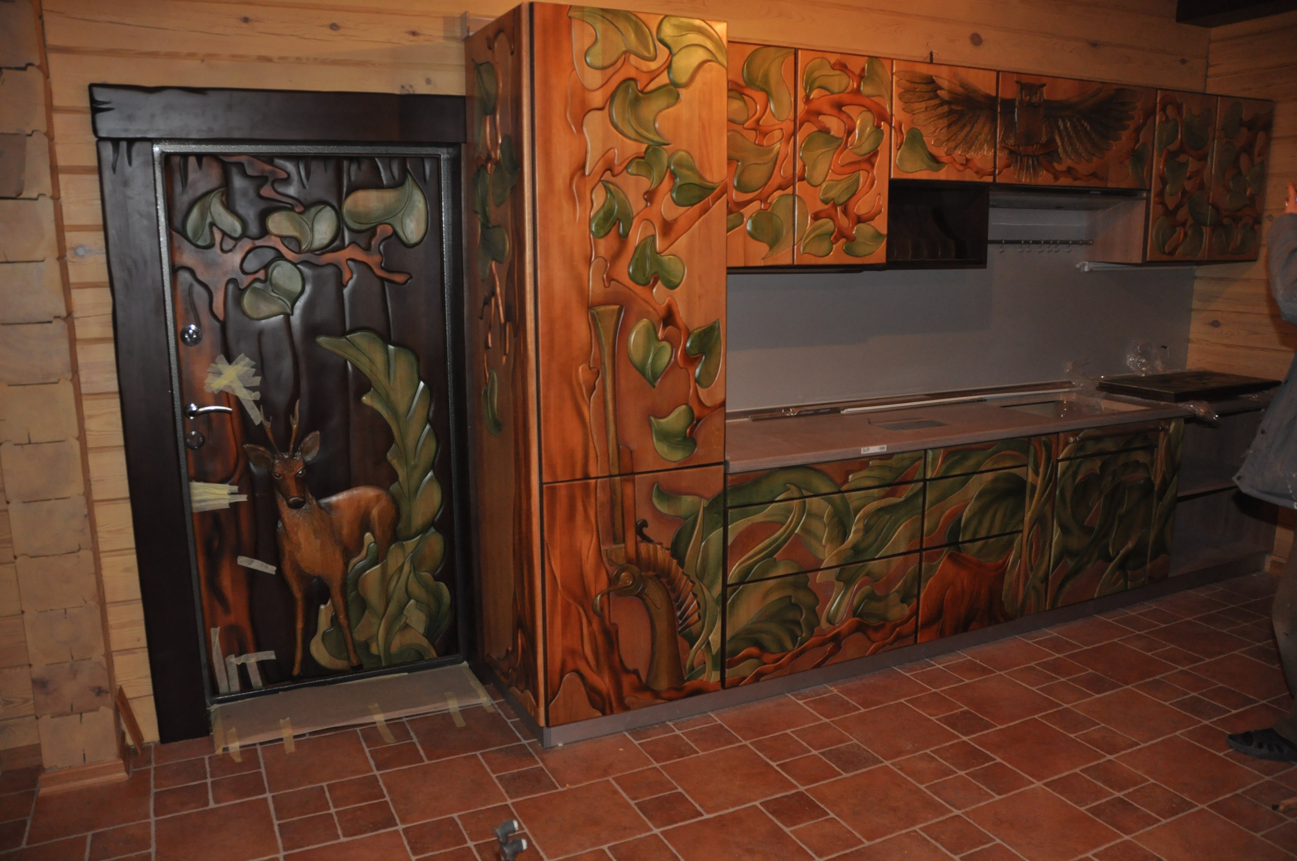Линейная кухня изготовлена из цельного массива дуба, который является невероятно прочным и долговечным материалом, обладающим очень хорошими показателями прочности к сопротивлению деформации при перепадах температур и влажности, что делает его наилучшим вариантом для загородных домов и дач. Конечно, главное изюминкой кухни является ее сложный и самобытный дизайн фасада с барельефной резьбой. Рисунок дополняет общую картину интерьера и тонирован.