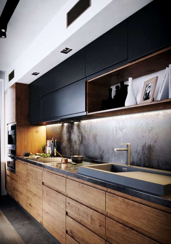 Прямая кухня из шпона в комбинированном цвете