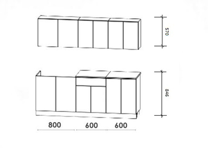 Материал фасада и корпуса: ЛДСП 16 мм. Ширина кухни 210 см.