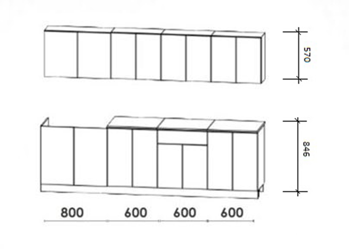 Внизу тумба под мойку 60х60 см и тумба с выдвижными ящиками.