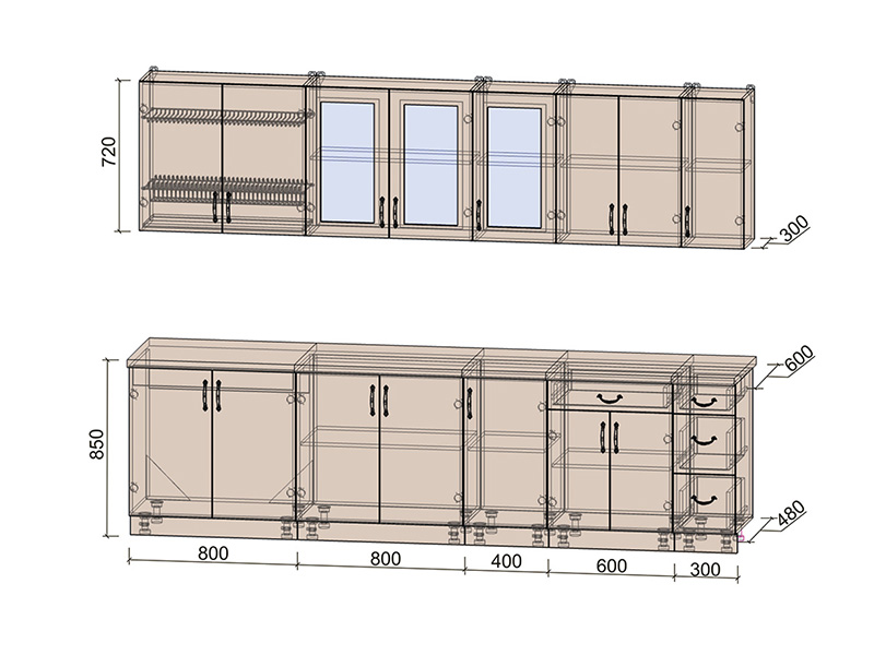 Навесной шкаф оснащен двухуровневой сушкой для посуды.