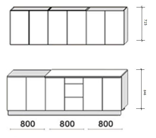 Кухня длиной 240 см. Фасады из ДСП двух цветов.