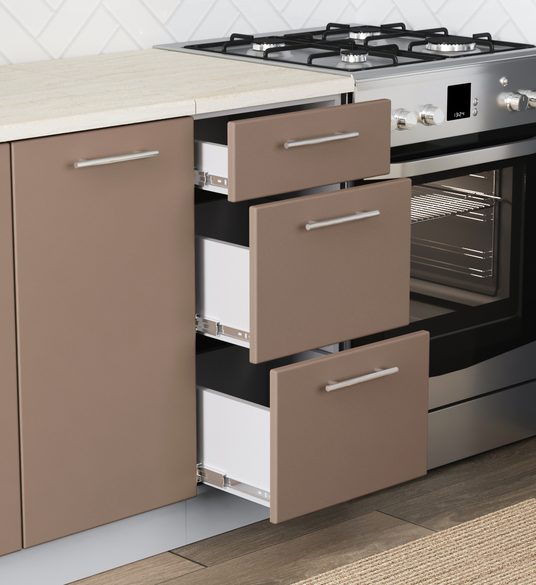 Фурнитура: петли с доводчиком, шариковые направляющие.