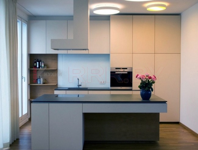 Торцевые ручки в напольных шкафах, навесные шкафы без ручек.