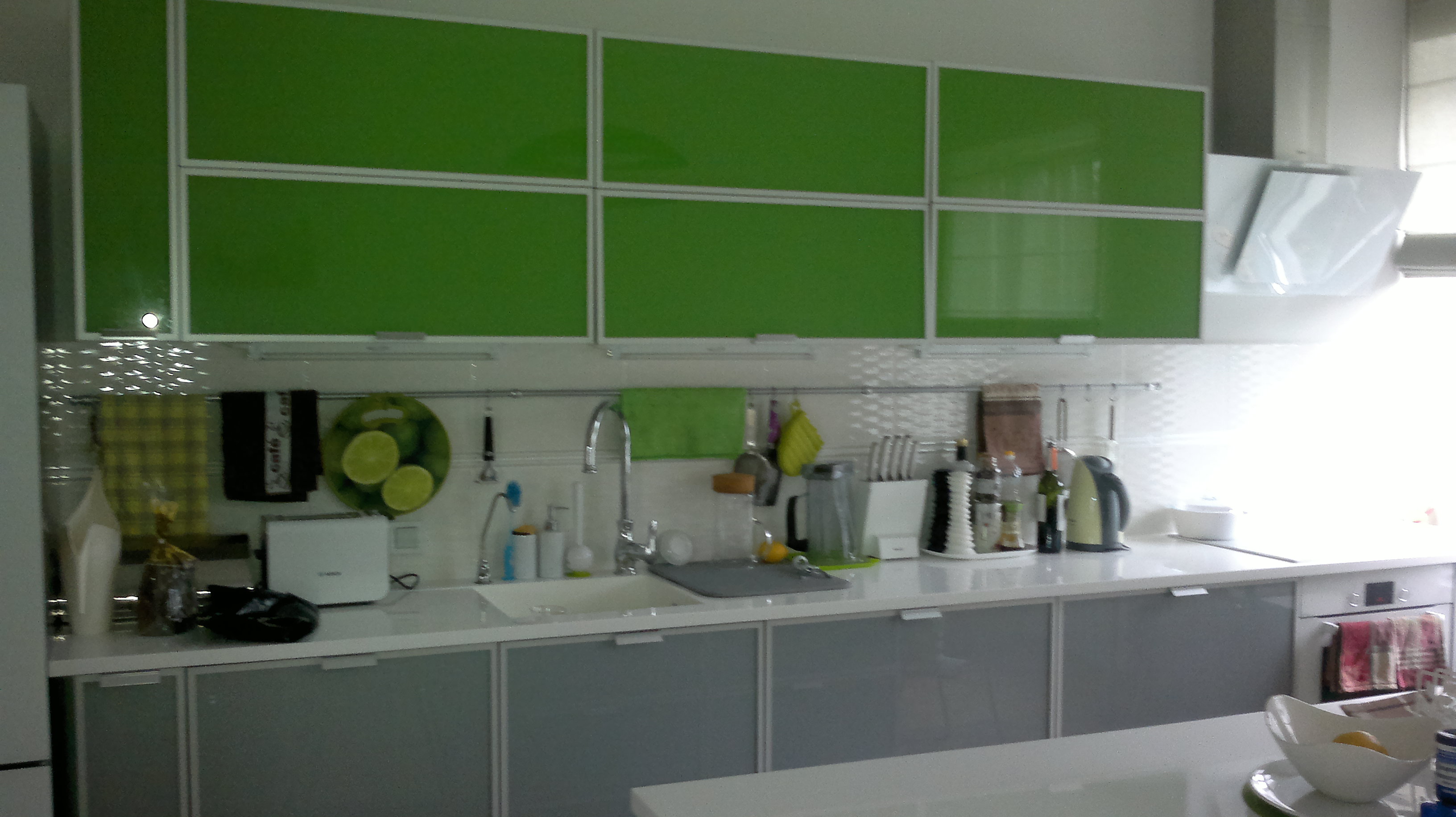 Современная кухня выполнена в салатовом и сером цветах на белом корпусе. Фасад имеет глянцевую поверхность и обрамлен алюминиевыми рамками, что добавляет модели интересный и неординарный вид. Кухня дополнена белой барной стойкой, расположенной возле стены, и островком, который можно использовать не только как дополнительную рабочую поверхность, но и обеденный стол.