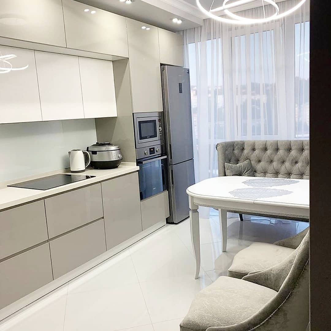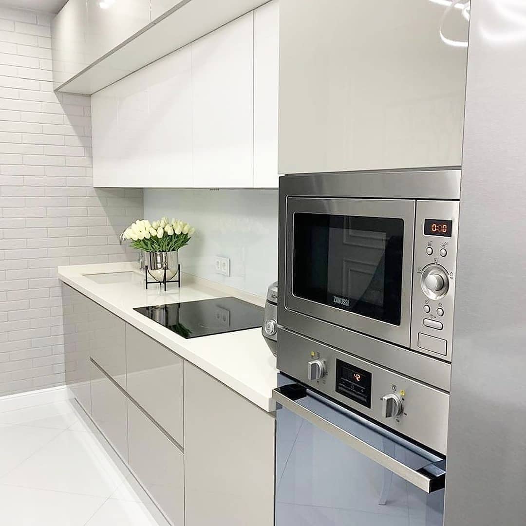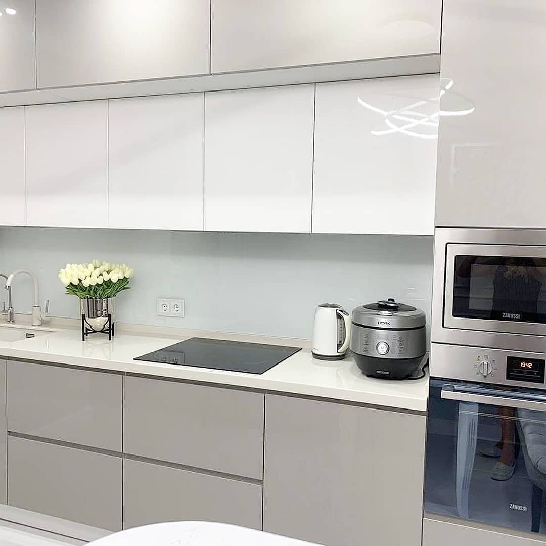Прямая кухня с глянцевыми фасадами серо-белого цвета