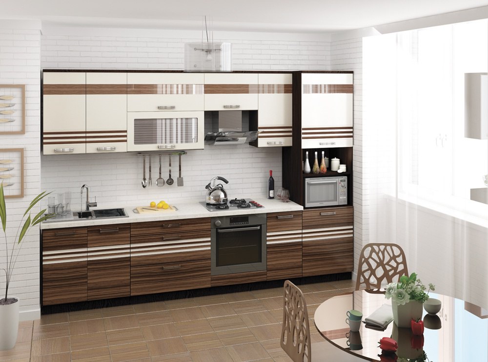 Вытяжка частично скрывается панелью верхнего фасада. Имеются застекленные и открытая ниши. Белая столешница под камень. Расцветка: кремовый - дерево зебрано в стильной комбинации горизонтальных полос разной ширины.