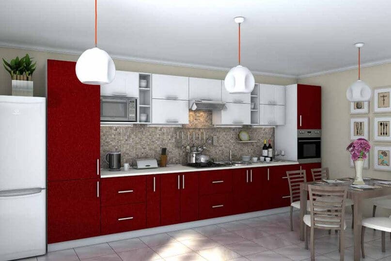 Современная линейная кухня. Разные цветовые решения фасадов и столешницы.