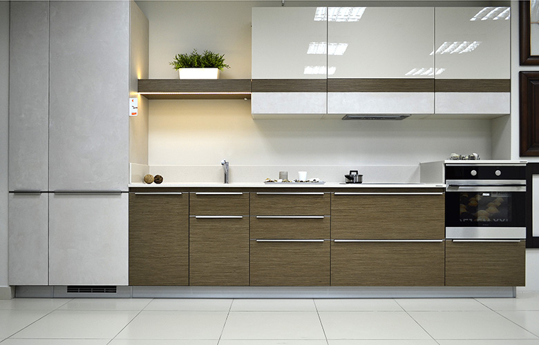 Модель современной кухни выполнена в двух, казалось бы, несовместимых цветах и структурах: глянцевый белый и коричневый с древесной текстурой. Навесной модуль отличается очень габаритными и вместительными шкафами, которые плавно переходят в открытую полку для специй или декоративных элементов. Кухня оснащена нишами для встраиваемой техники.