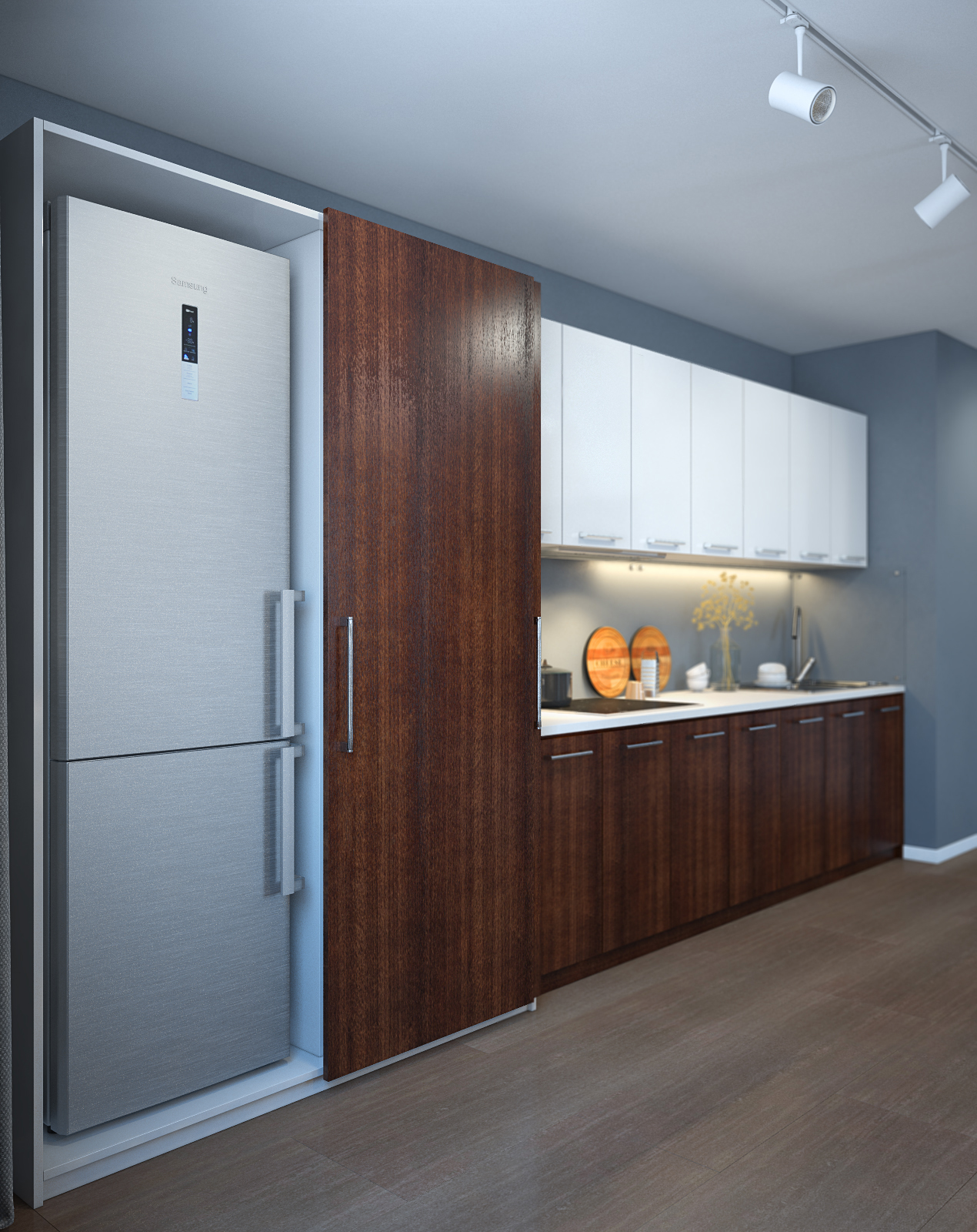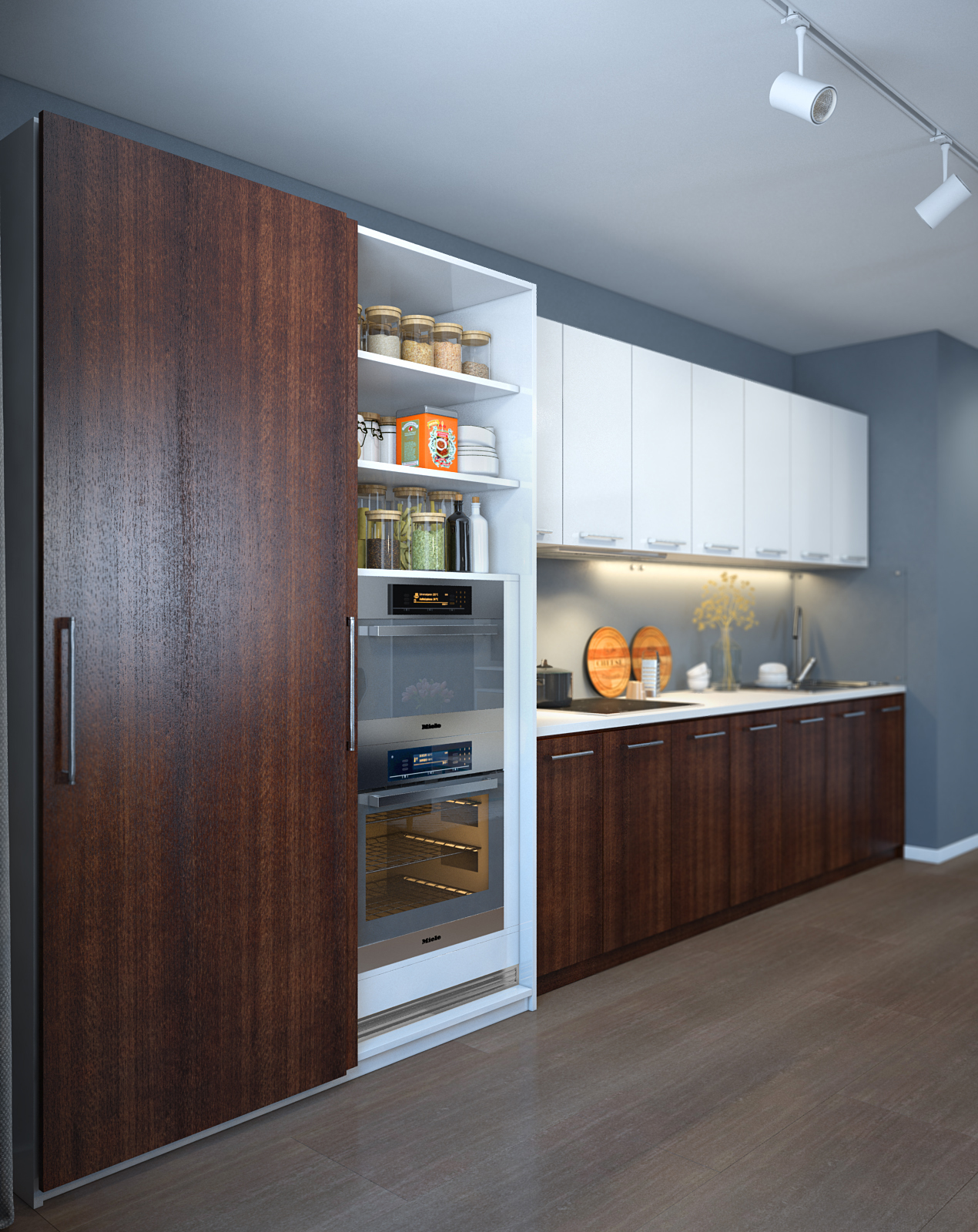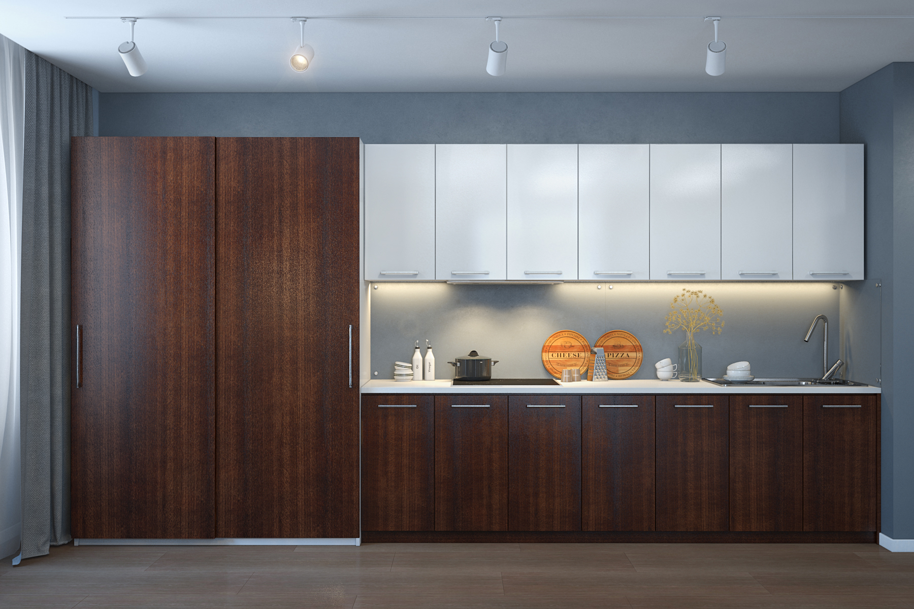 Необычный линейный кухонный гарнитур с белым навесным модулем, а также со шкафом-купе и низом с четкой вертикальной фактурой дерева под темный орех. Столешница и каркас матовой белой расцветки. За двумя створками шкафа скрываются полки для провизии, ниши для холодильника, встроенной духовки и СВЧ. Фасады изготовлены с длинными прямоугольными ручками-скобами.