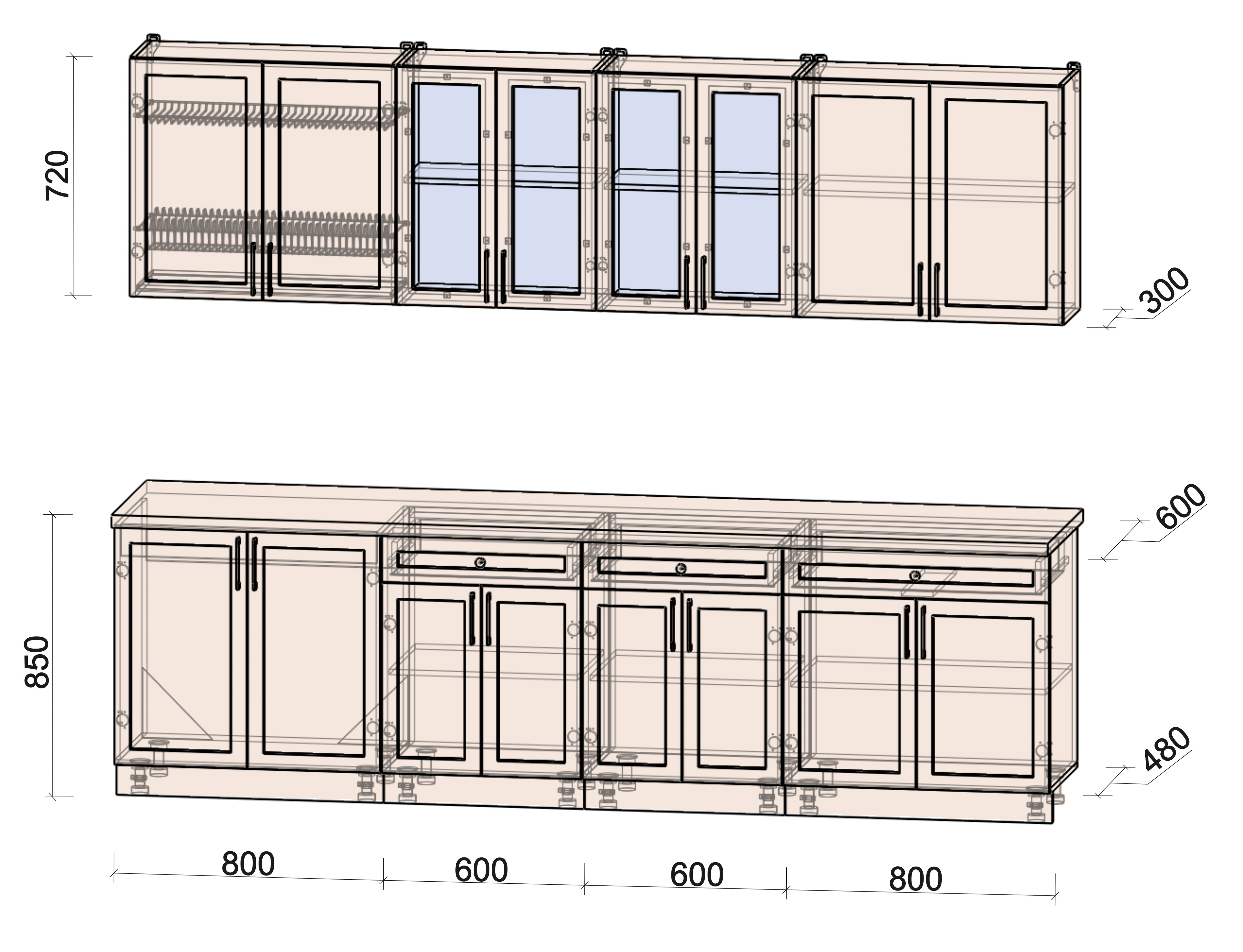 Материал фасада и корпуса: ЛДСП 16 мм. Ширина кухни 160 см.