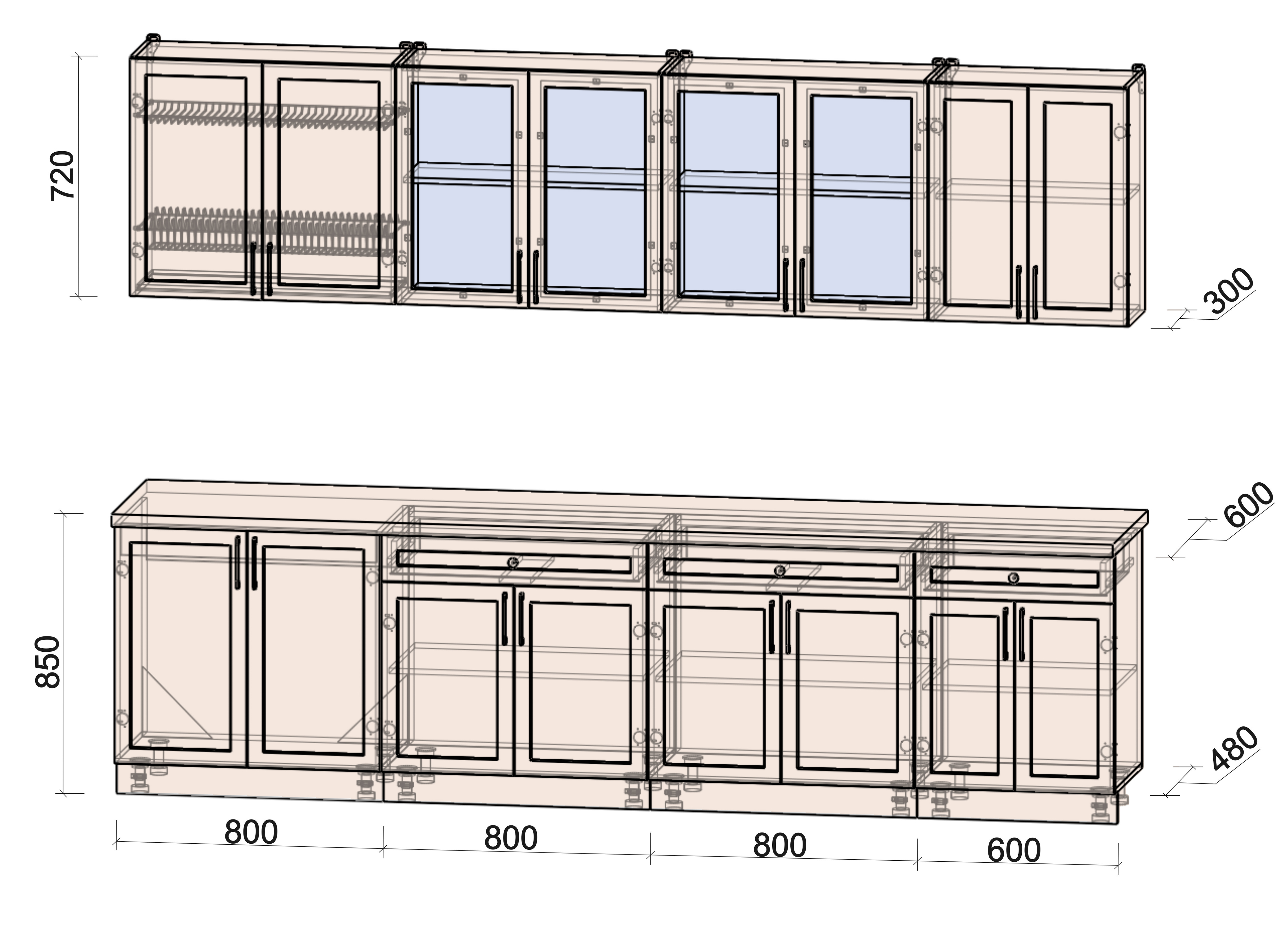 Верхняя линия шкафчиков с стеклянными вставками и открытыми полками.