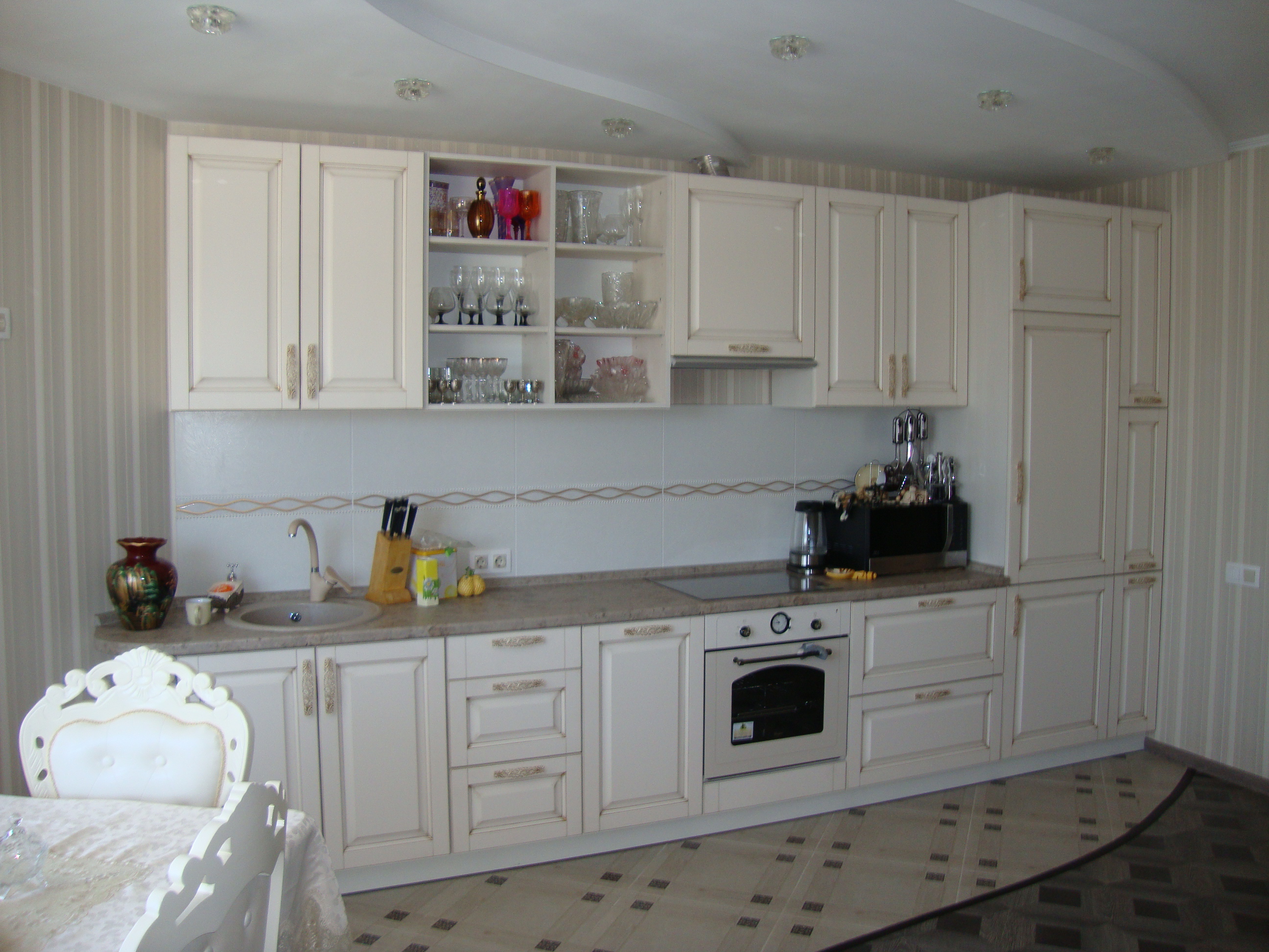 Двухметровая кухня с фасадами из ЛДСП двух цветов.