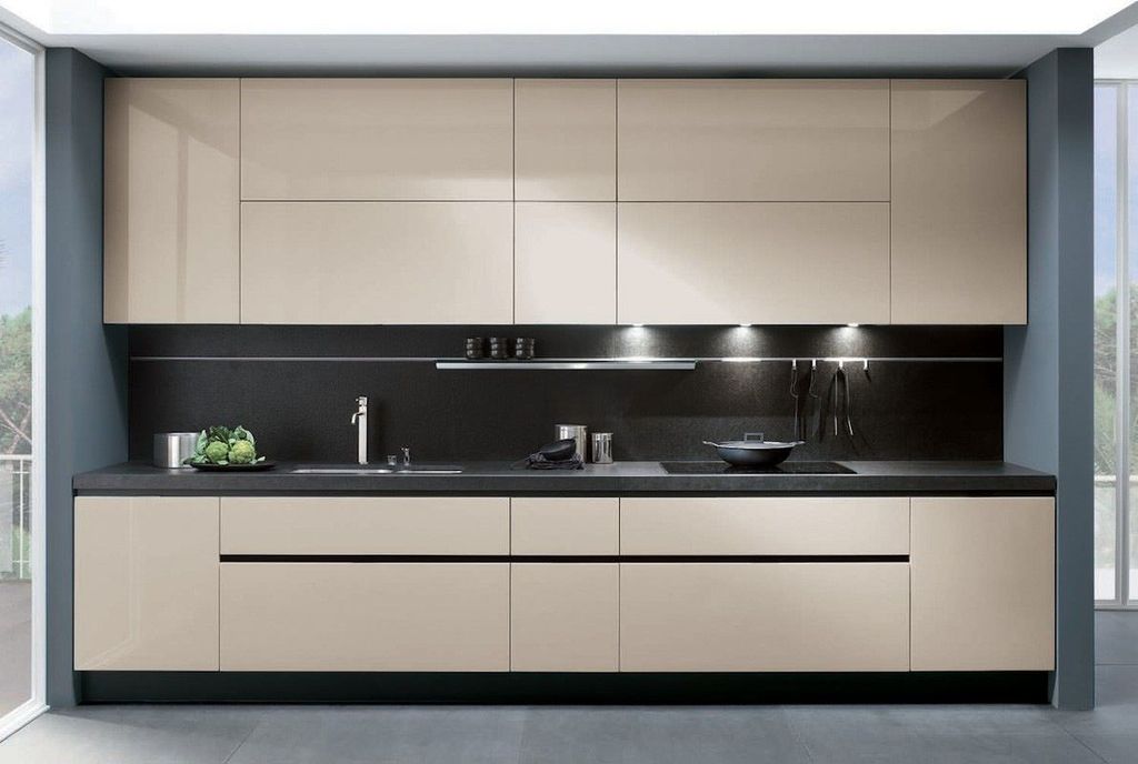Лаконичная и стильная – так можно охарактеризовать данную прямую кухню в молочном цвете. Легкий глянец фасадов и матовый угольный цвет корпуса и скинали полностью завершают образ. Благодаря линейной формы конструкцию без труда можно расположить в любой части комнаты и подстроить под любой интерьер в силу своего универсального дизайнерского исполнения.
