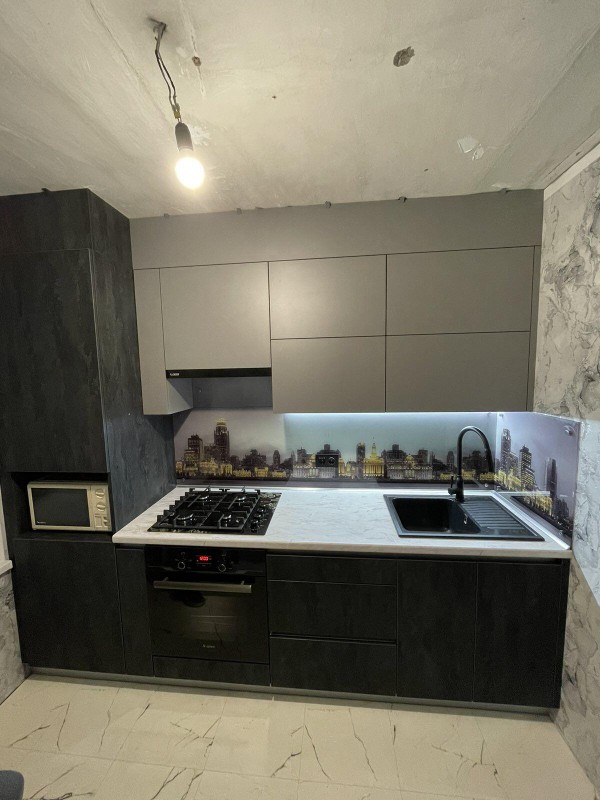 Стильная угловая кухня в полной комплектации. Фасады матовые с частичным остеклением сверху.