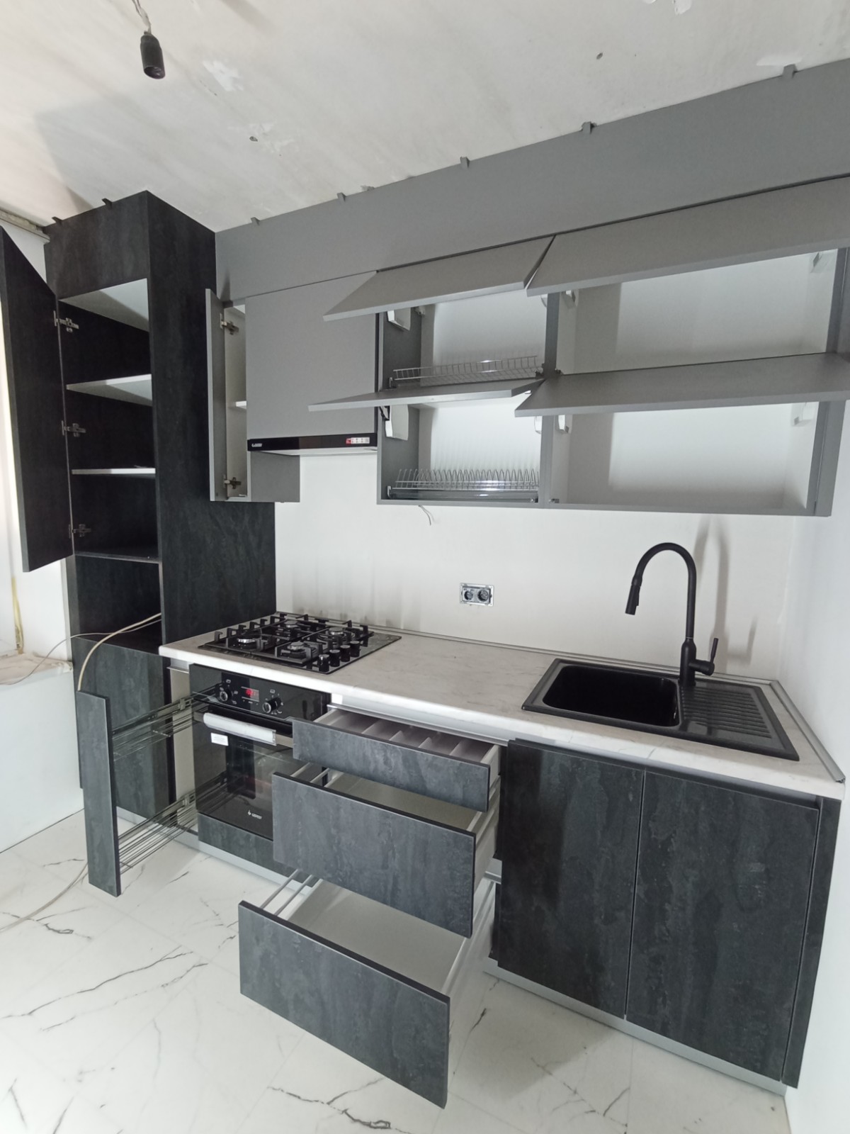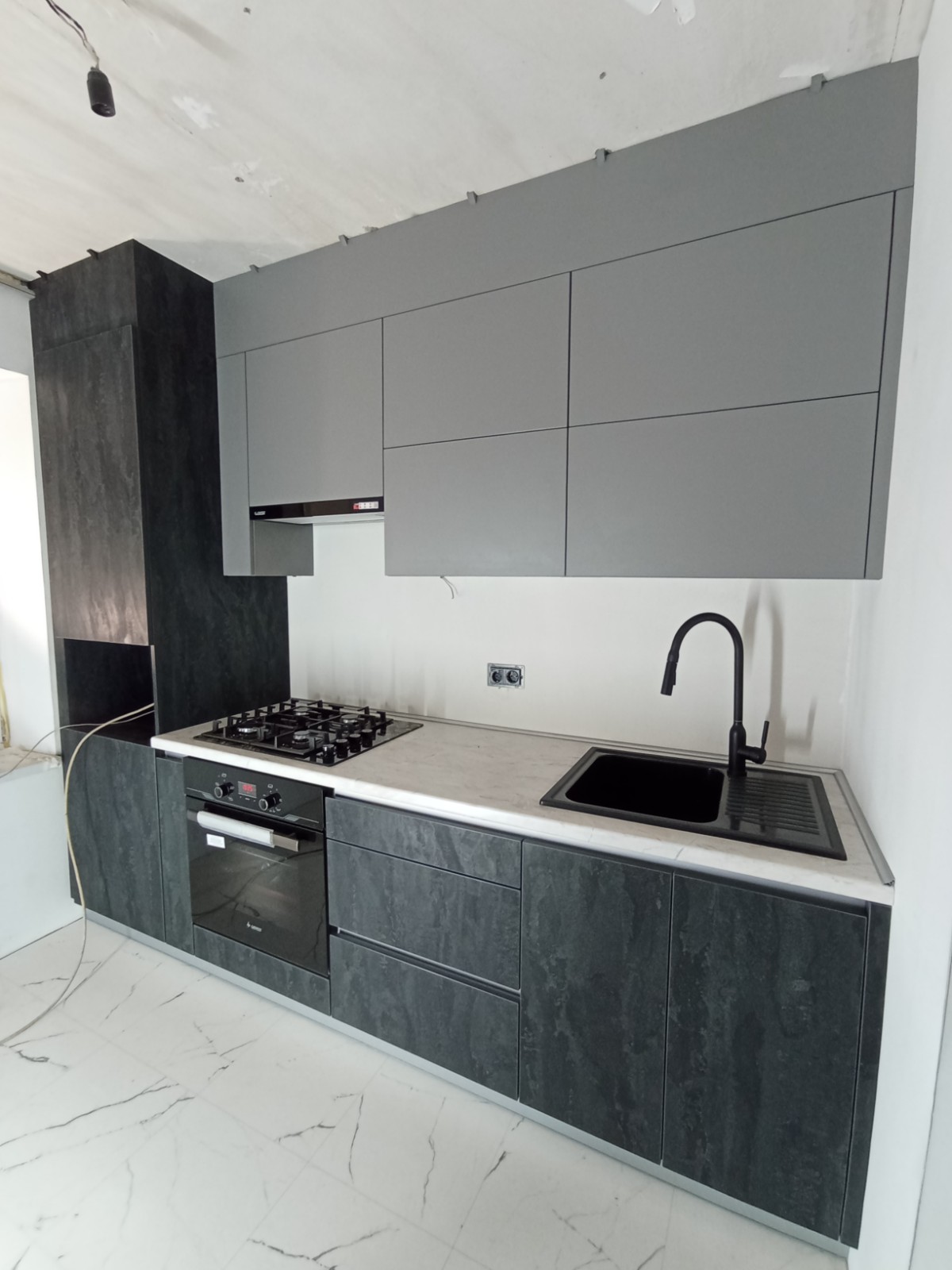 Современный и функциональный гарнитура с высокими шкафами и компактной барной стойкой.