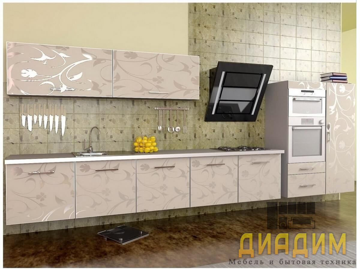 Данная конструкция необычна тем, что является подвесной. Бежевые фасады декорирована глянцевыми плетеными узорами. Столешница отличается по цвету. Фурнитура металлического окраса отлично смотрится с фасадами и «не бросается» в глаза. Ей характерна простая прямая форма.