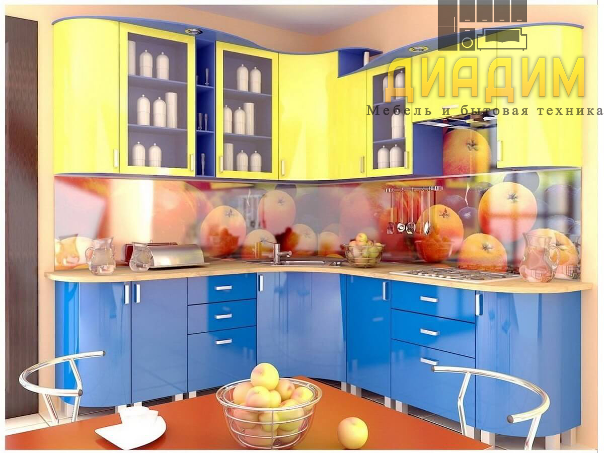 Угловая кухня выполнена в ярком комбинированном цвете. Ее глянцевая поверхность гладкая на ощупь. Фасады верхнего вида желтые, нижнего – синие. Она необычна тем, что радиусная: благодаря этому мягкому переходу, при эксплуатации риск получения травмы снижен в несколько раз по сравнению с острыми простыми формами кухонь.