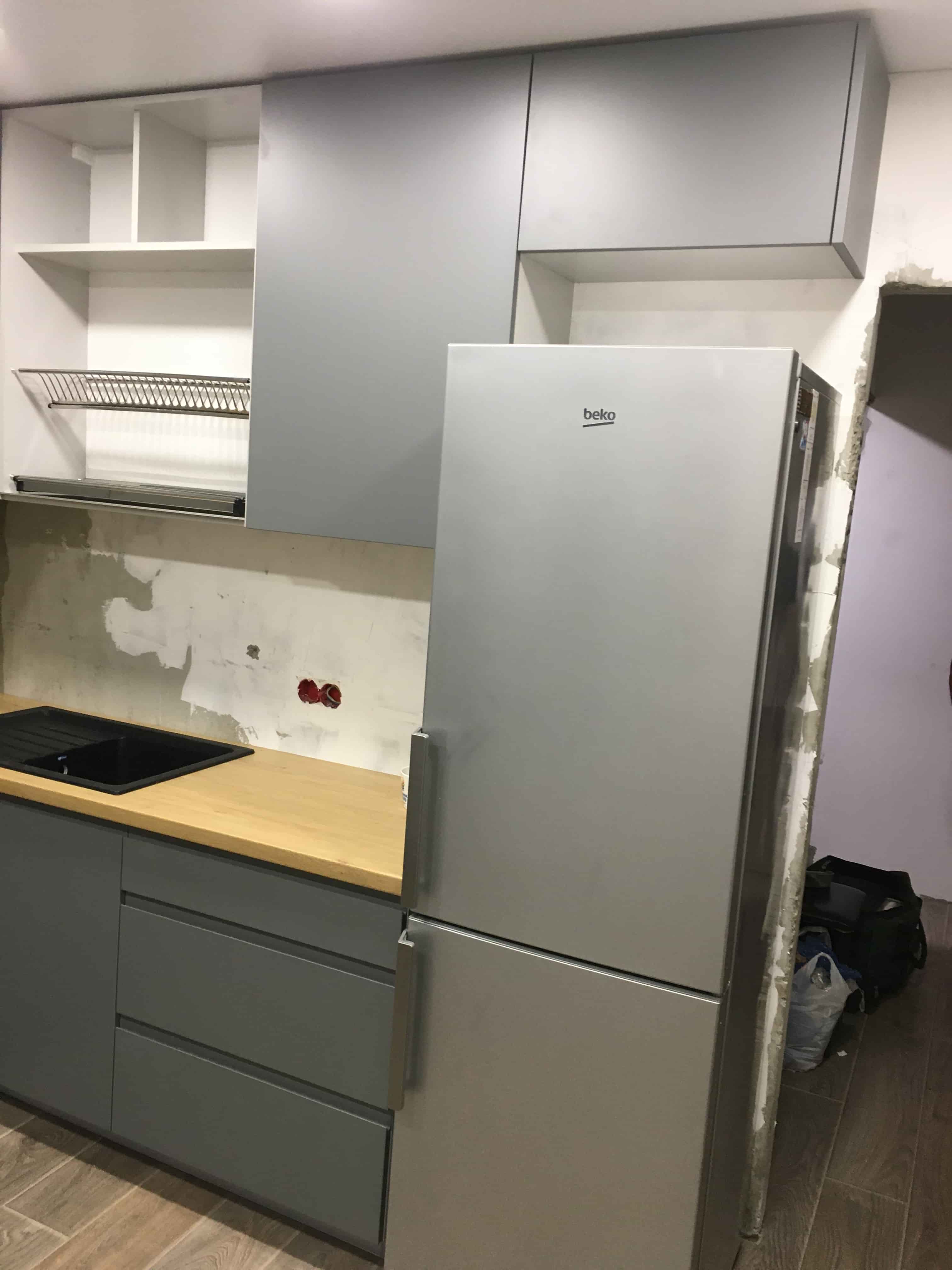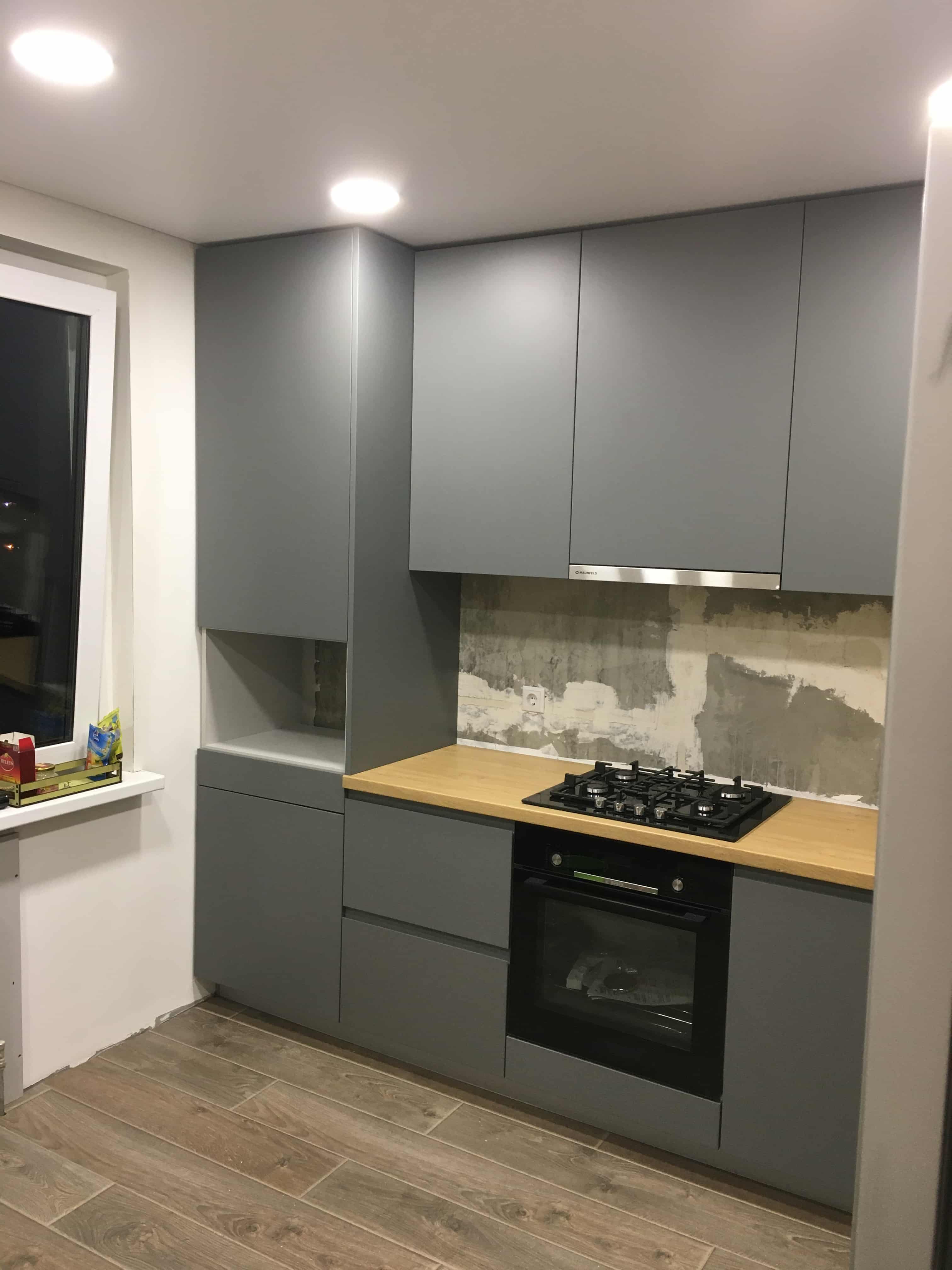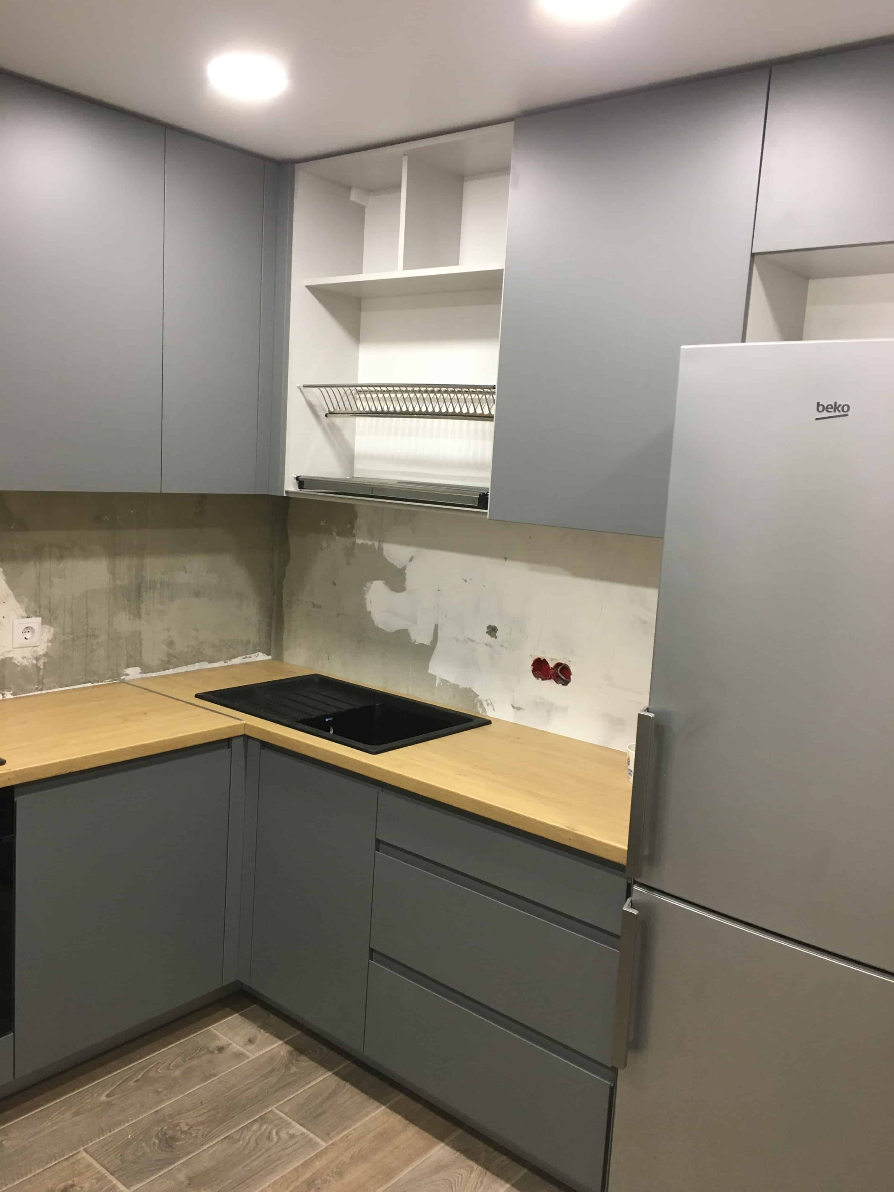 Серая матовая кухня угловой конфигурации