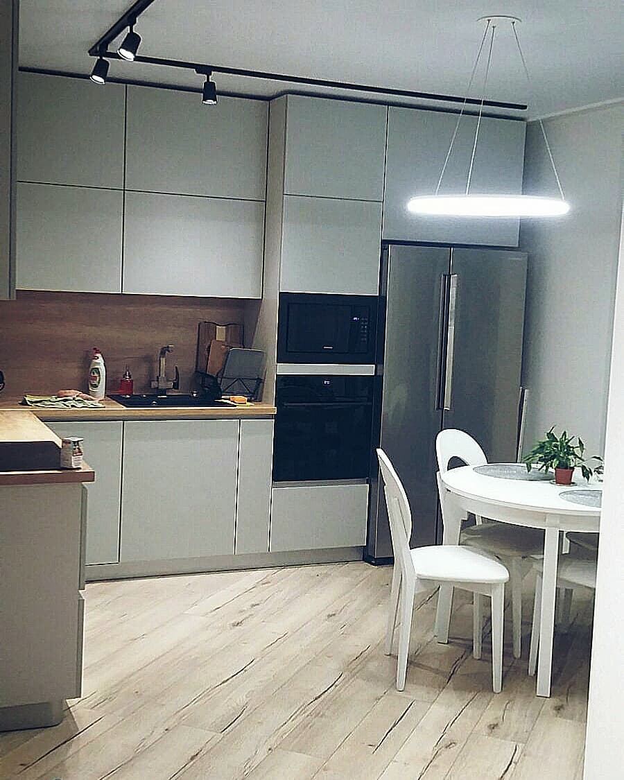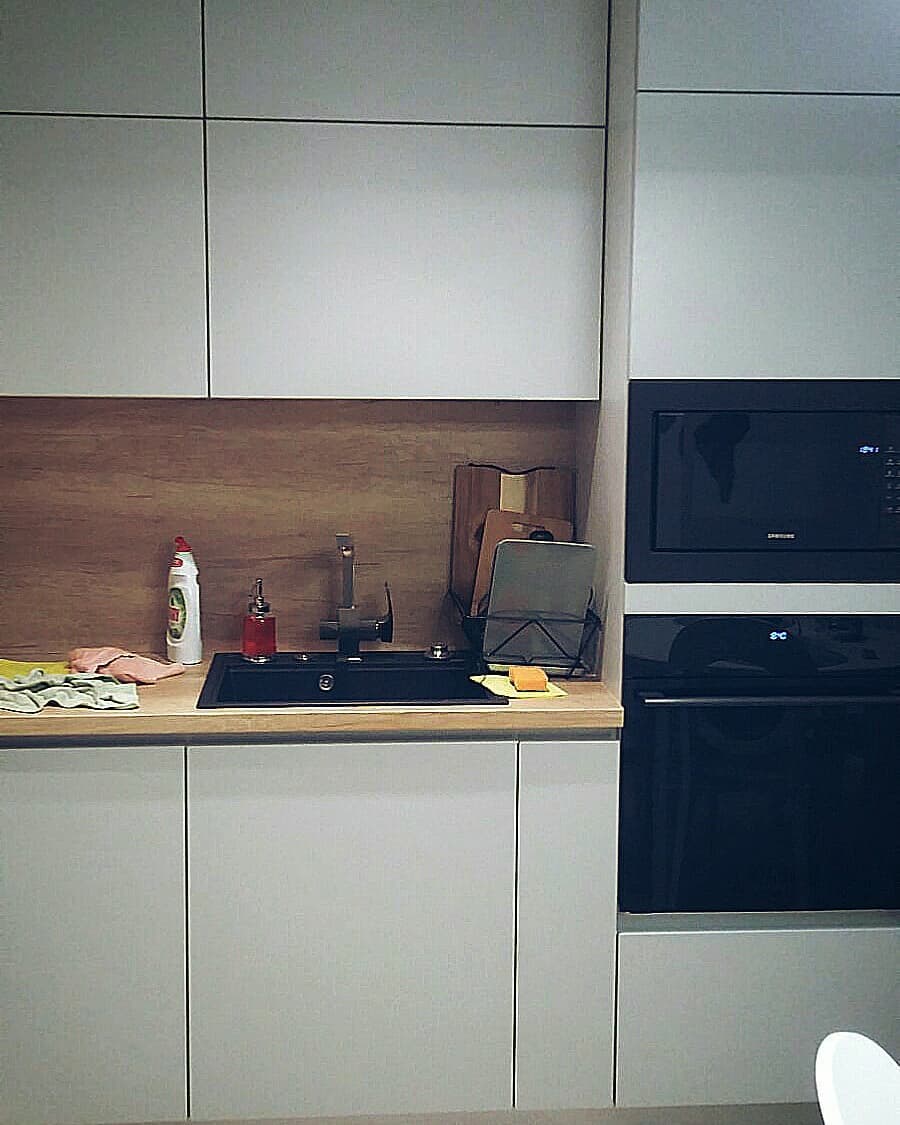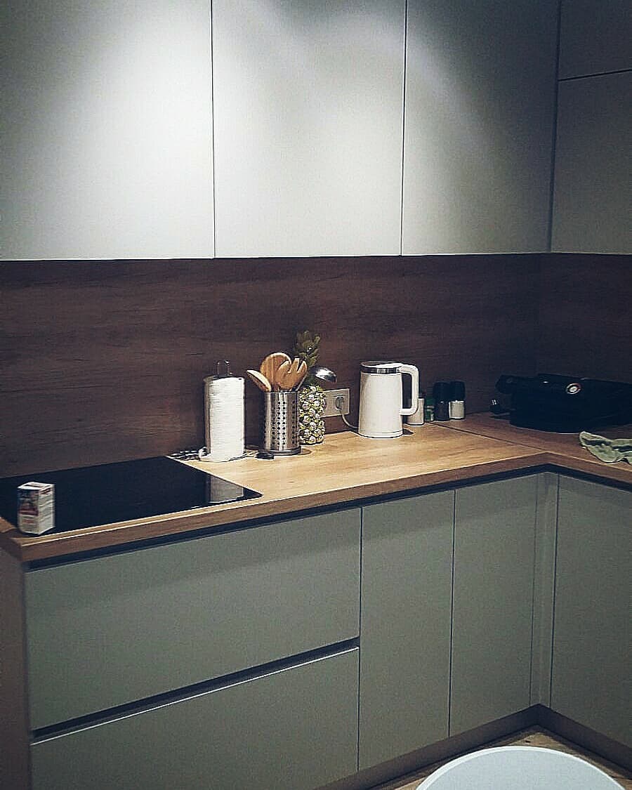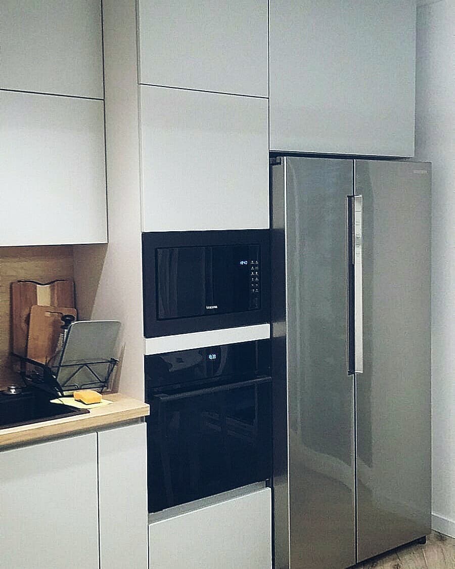 Светлая столешница под мрамор, черные стекла и матовые ручки.