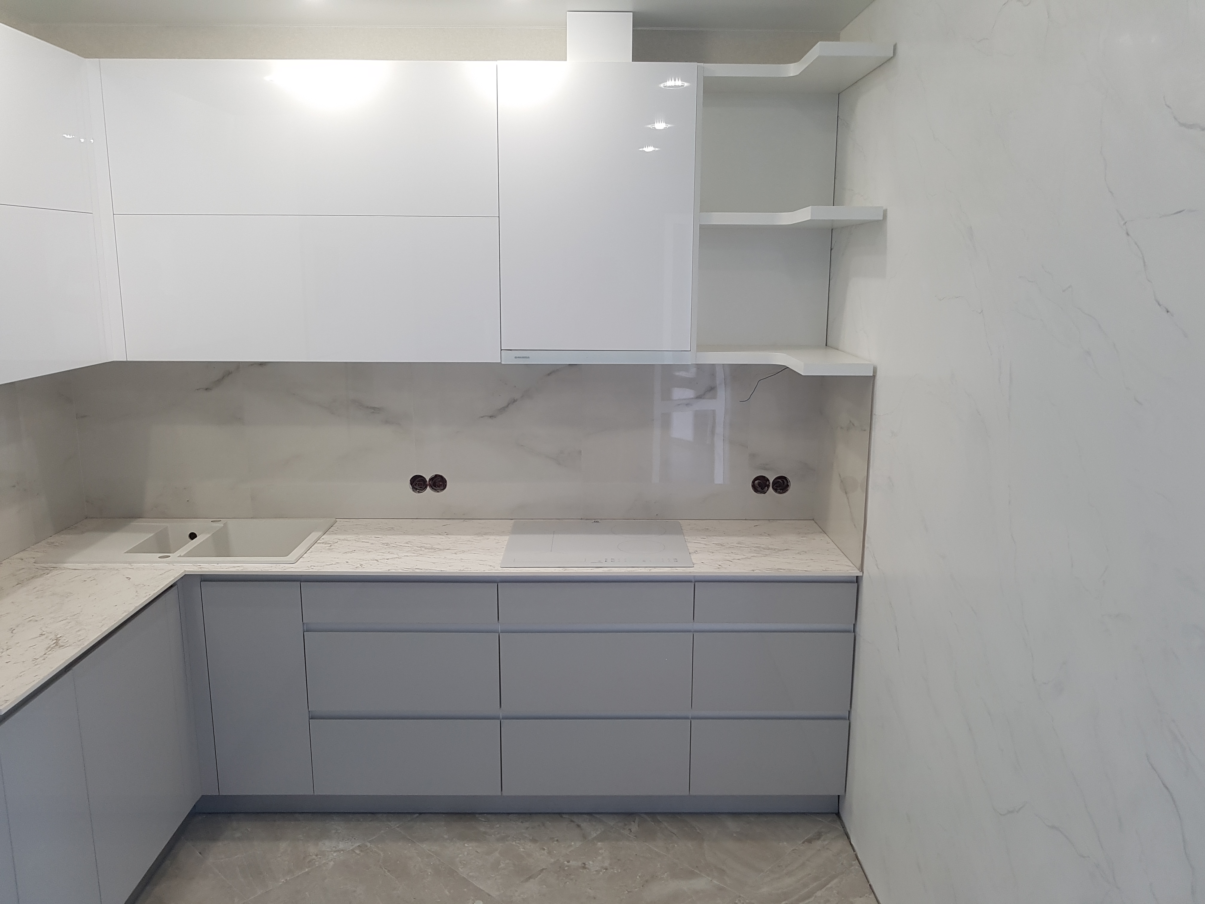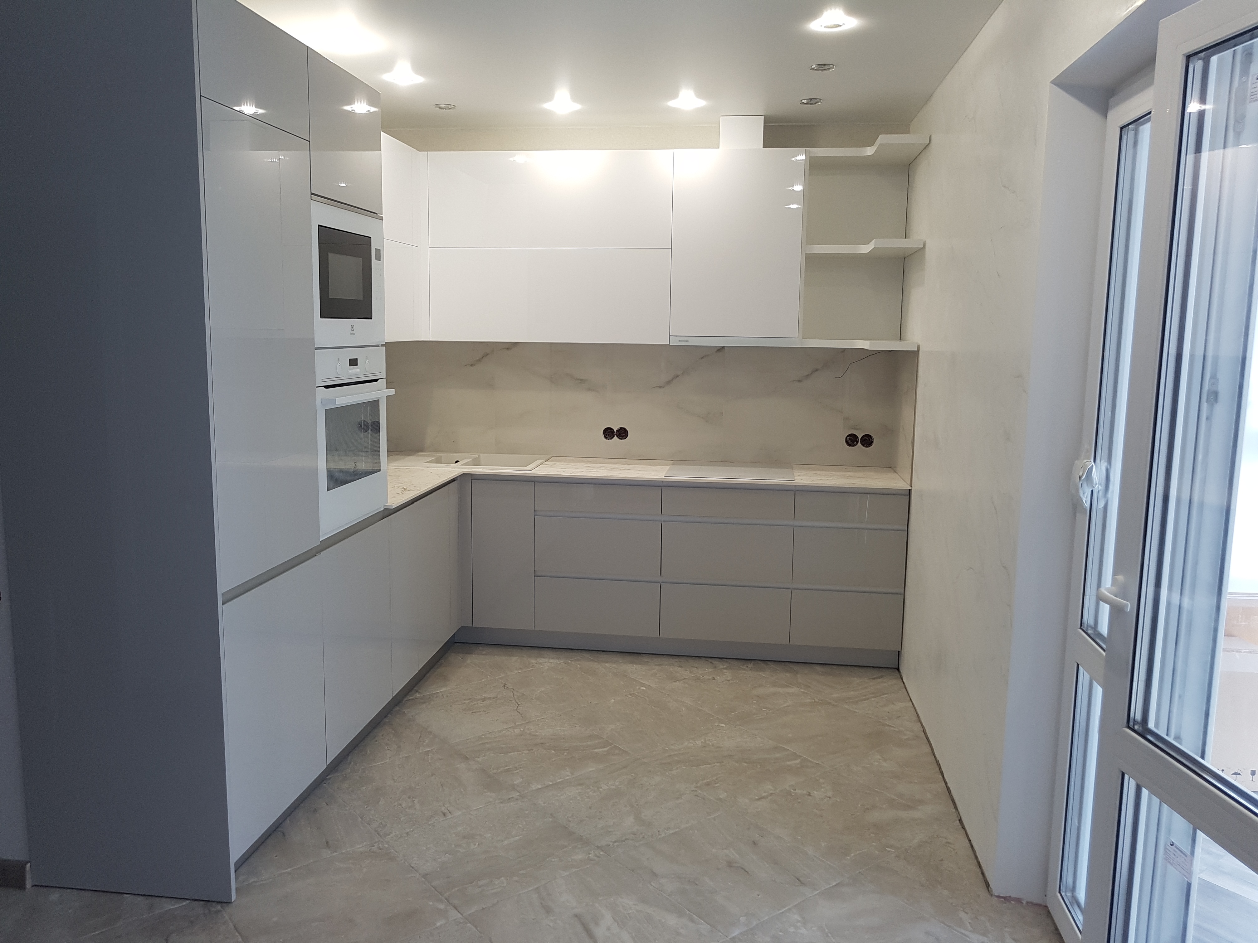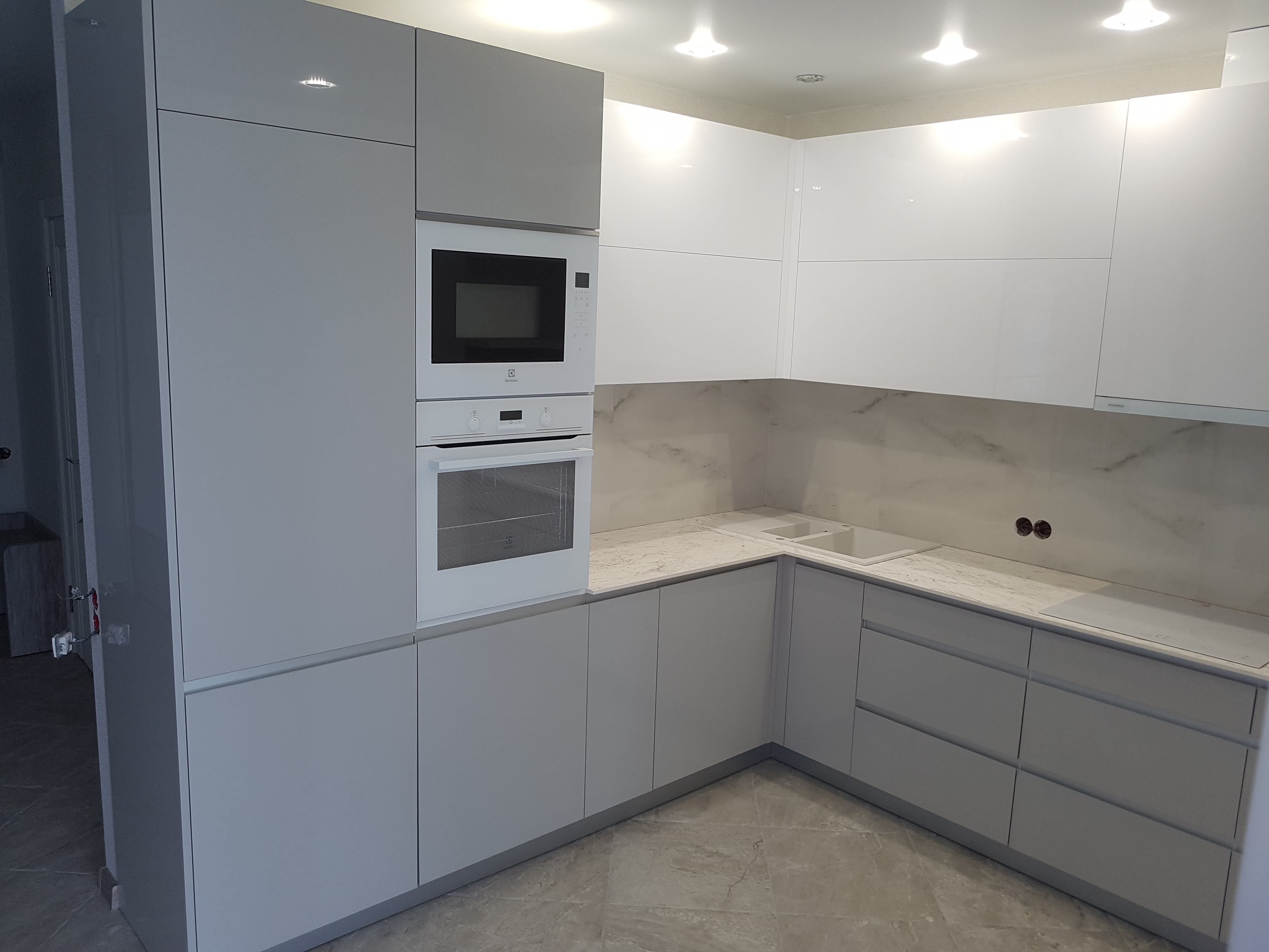 Серая угловая кухня с фасадами без ручек