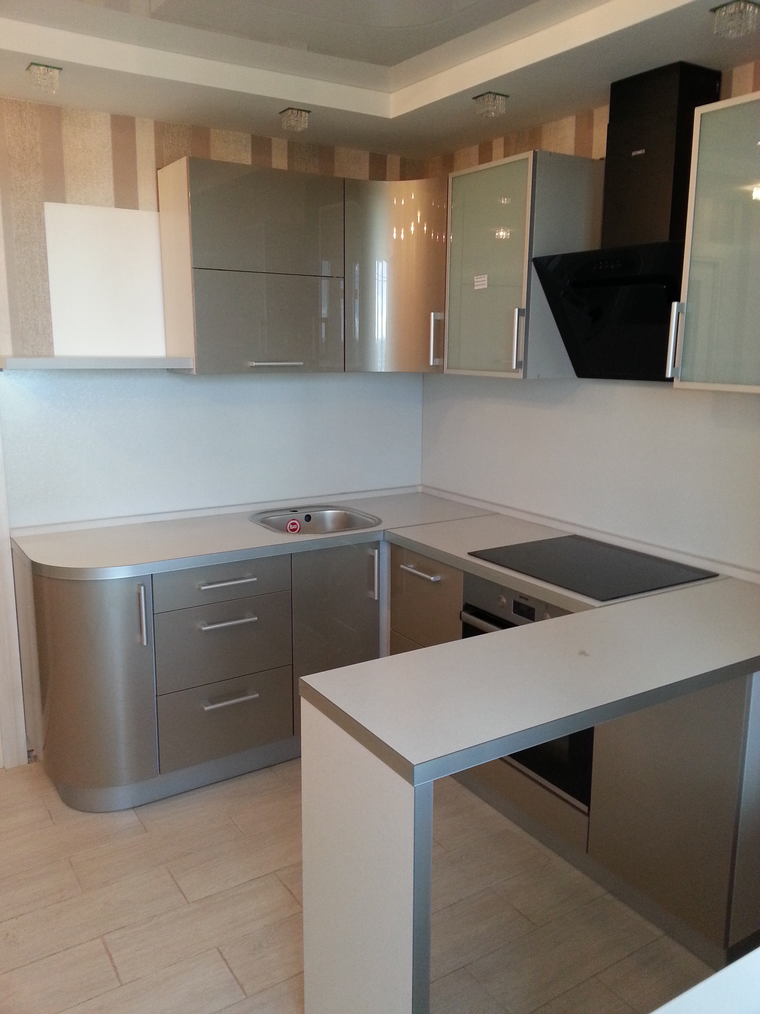 Угловая кухня с округлыми глянцевыми фасадами из акрилового пластика в цвете серый металлик. Компактный верх с полкой у внешнего торца и двумя навесными модулями с полупрозрачным стеклом лакомат в алюминиевой раме по обе стороны от вытяжки. Белая матовая столешница и торец стойки. Ручки-рейлинги и серый матовый цоколь.