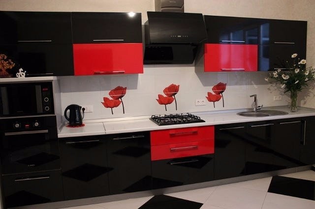 Данная модель выполнена в стильном сочетании черного и красных цветов. Интересным акцентом фасада является белая столешница.