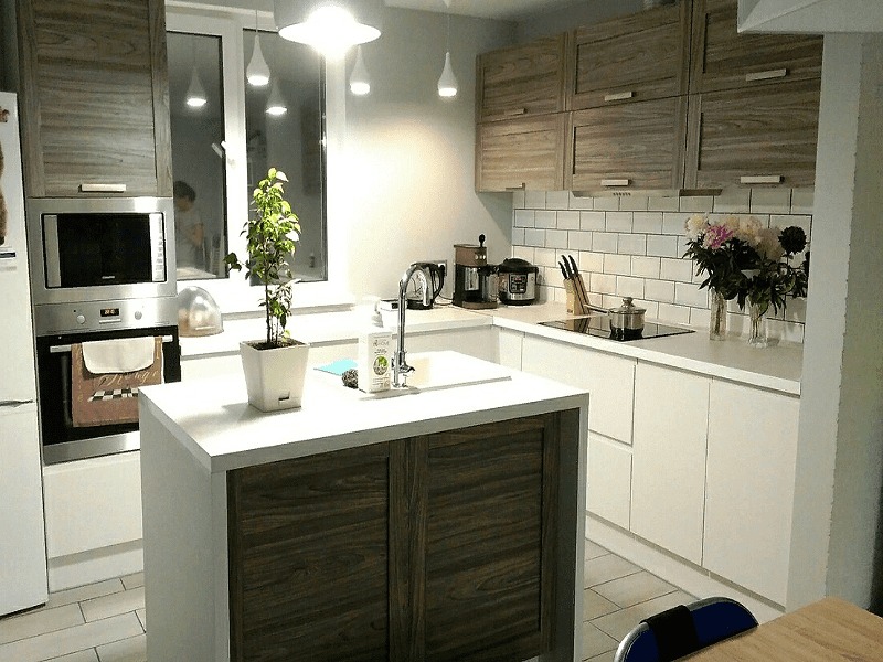 Темные и светлые фасады из пленочной МДФ. Ширина кухни 220 см.