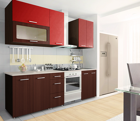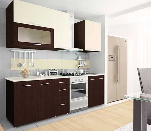 Кухня длиной 260 см. Сочетание яркого и темного цвета фасадов.